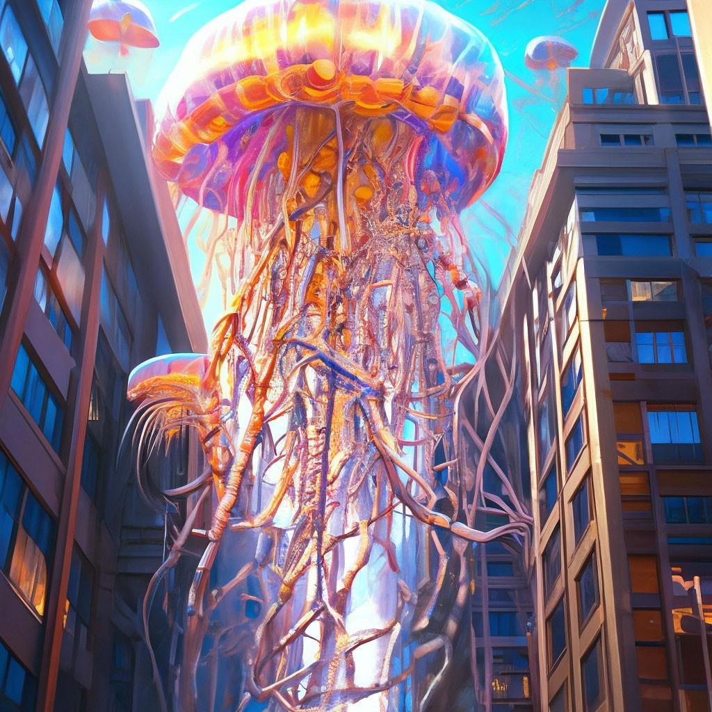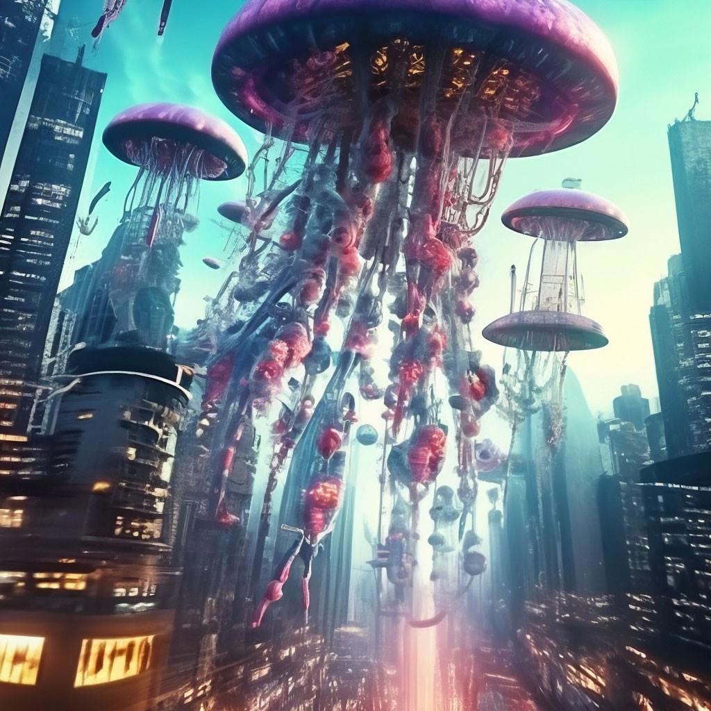 Немного жути от нейросети. Фентази. Сюрреализм. Бионические медузы захватили город.