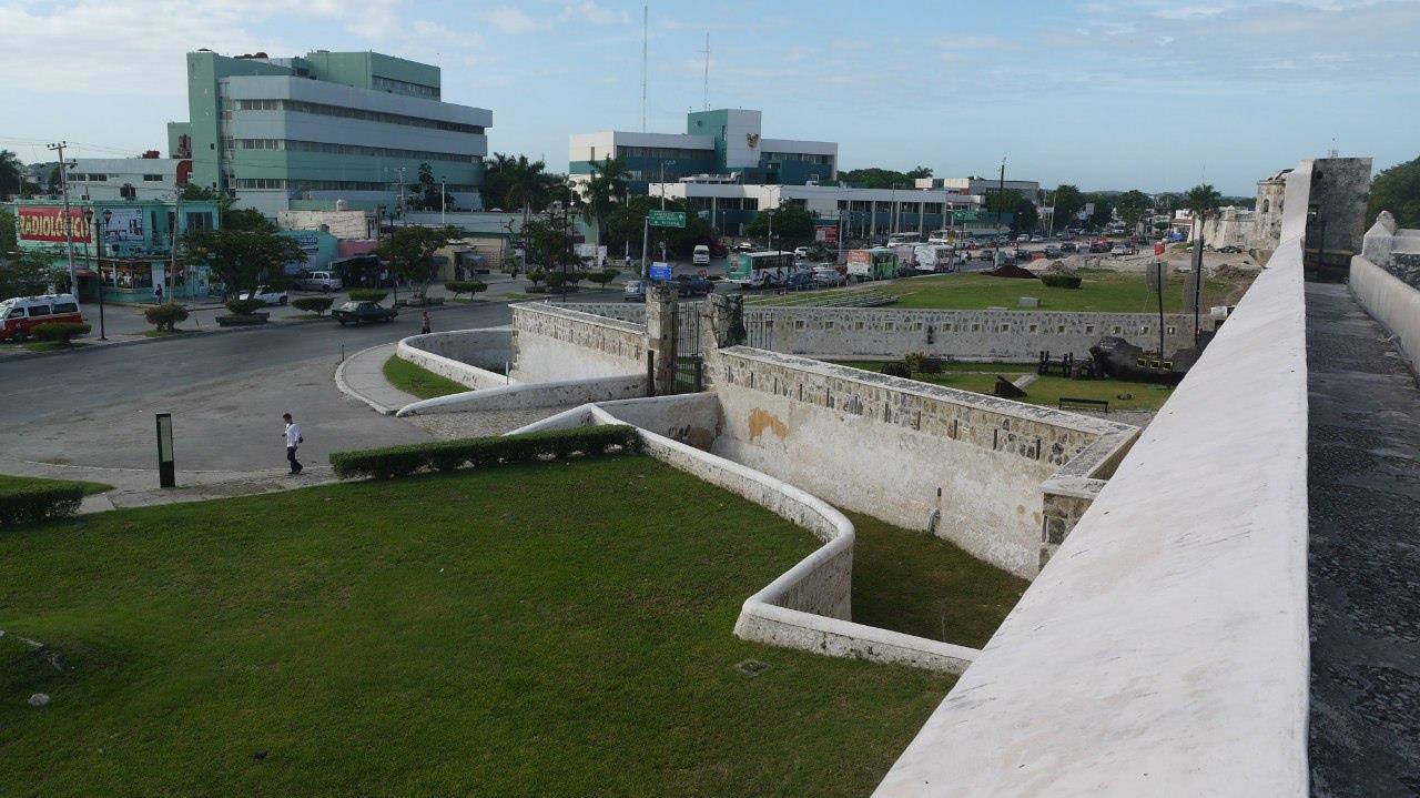 Сан Франсиско де Кампече. Бастионы крепости. Английские и голландские (протестантские) пираты терроризировали колонии католической Испании на протяжении 160 лет. Город атаковали Френсис Дрейк, Джон Коукинс, Лоренс де Грааф, Корнелис Джой, Генри Морган и другие знаменитые пираты. Начало строительства укреплений - 1686 г. Для строительства привлекли французского архитектора.