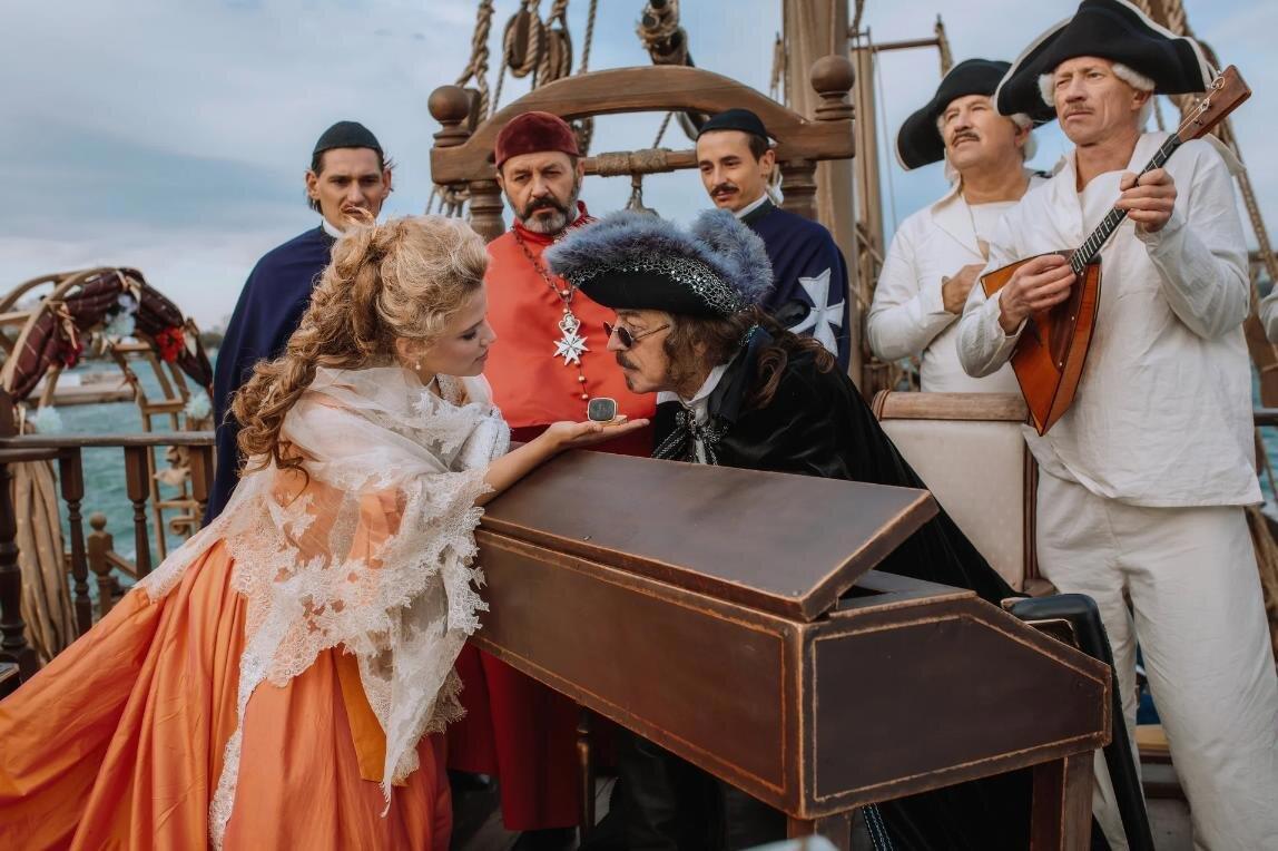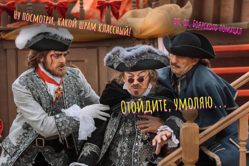 Граф Орлов зовет капитана корабля и командует выдать Домогарову Харатьяна для подвига. У капитана корабля на лице нарисован такой шрам, что сначала даже непонятно, действительно ли ему пытались нарисовать шрам или его просто наотмашь ударили помадой.