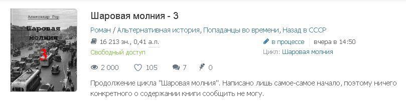 Автор: Александр ГорЕщё суток не прошло с момента публикации первого фрагмента книги Шаровая молния - 3. А цифры, что показывает статистика, очень даже вдохновляют: