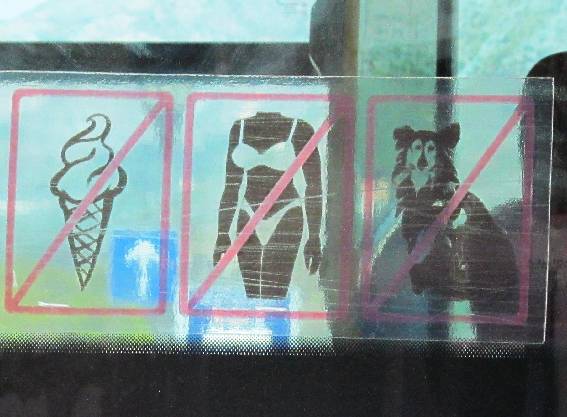 Автостанция. Девчонки – немки или шведки – стоят, автобуса ждут, загорают. Подошел автобус - с табличками-предупреждениями – с собаками нельзя, и в купальниках тоже нельзя… Девчонки майки надели) Уж пришлось! Хорошо, колготки надеть не заставили!