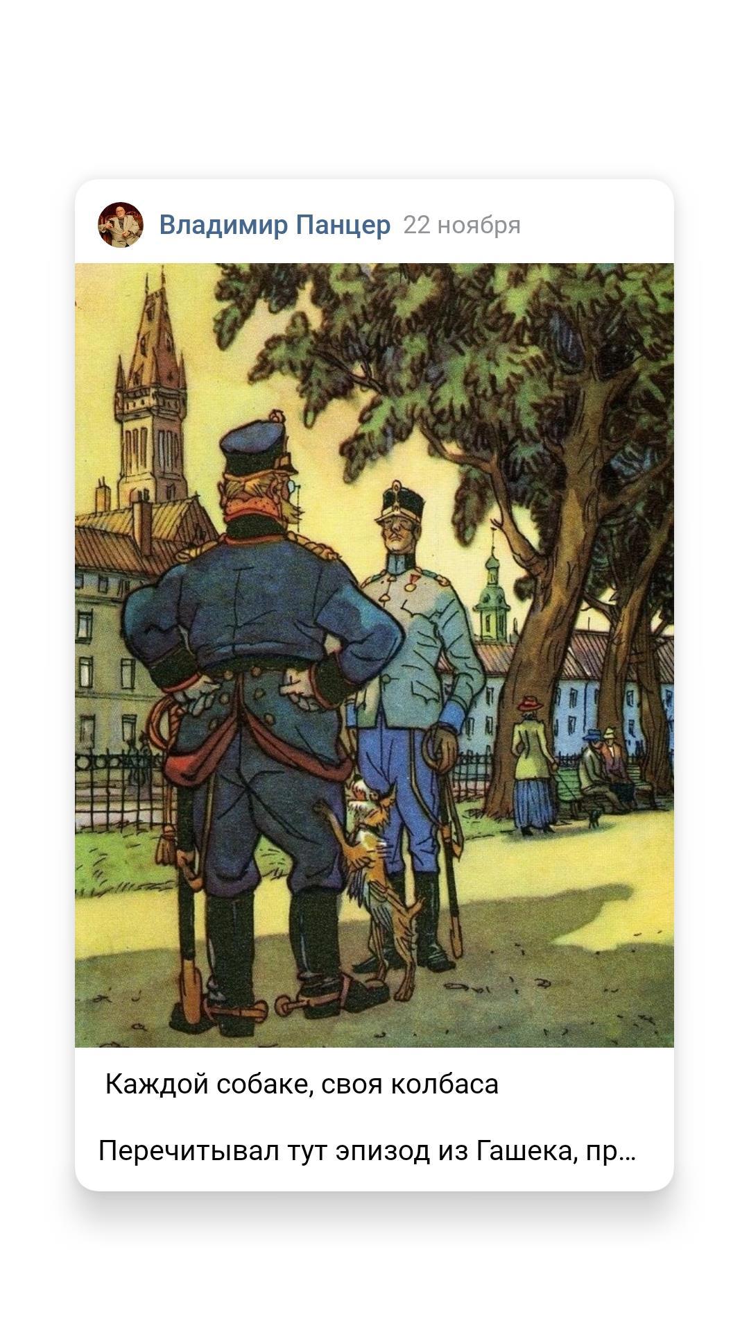 Перечитывал тут эпизод из Гашека, про то как Швейк поймал на колбасу собаку полковника (у меня там любимая фраза: "... Полковник дает объявление, а поручик их не читает!... ".