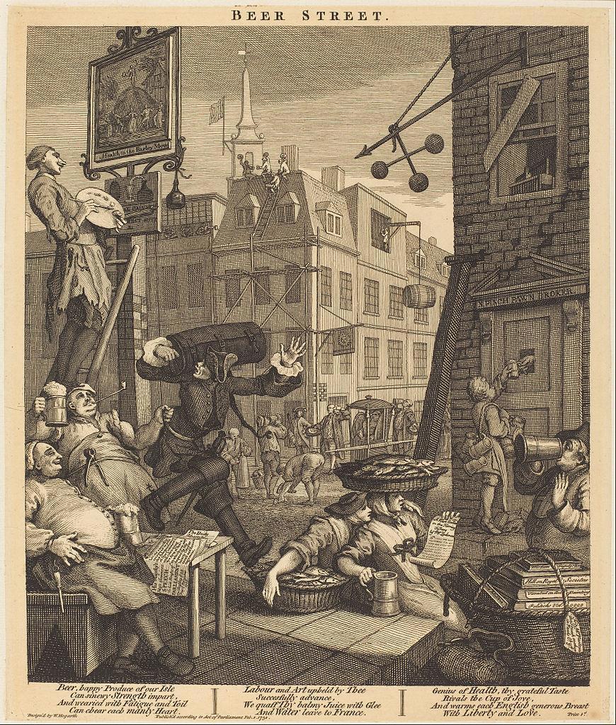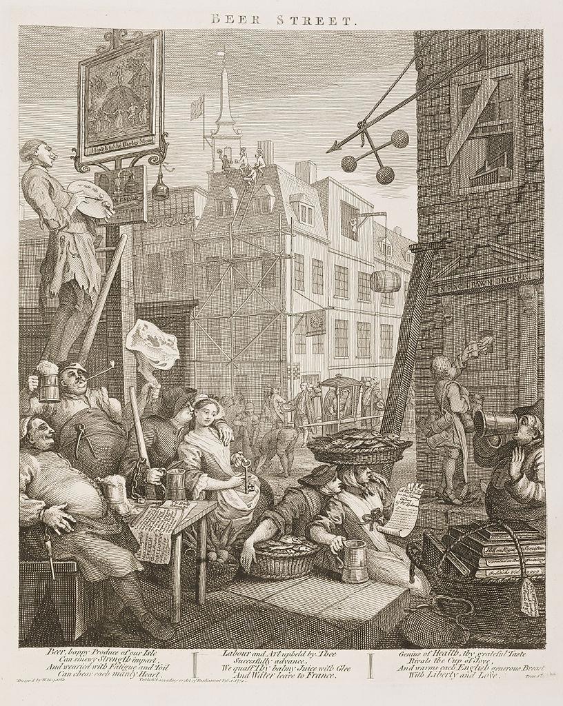 Гравюра "Beer Street" изображает счастливых и здоровых жителей "Пивной улицы".