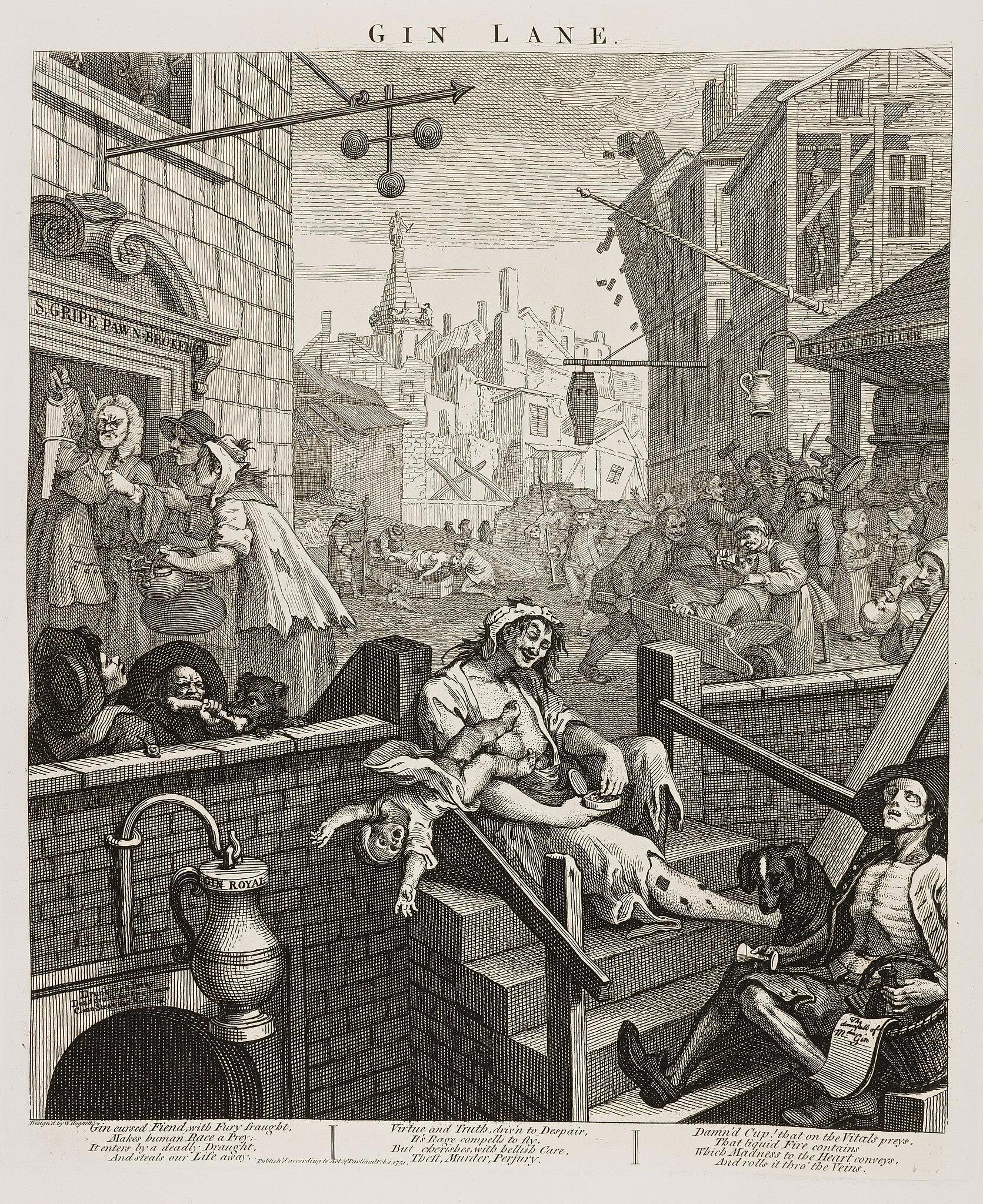 Чтобы справиться с ситуацией, британский Парламент принимал законы, контролирующие производство и потребление джина пять раз за четверть века (в 1729, 1736, 1743, 1747 и 1751 годах). Общественную кампанию по борьбе с алкоголизмом возглавил еписоп Содора и Мэна Томас Уилсон. Его поддержали многие известные британцы, среди которых можно назвать Даниеля Дефо, Генри Филдинга, Джошуа Такера. А художник Уильям Хогарт создал в 1751 году две гравюры, которые были напечатаны в газете The London Evening Post в середине февраля 1751 года.