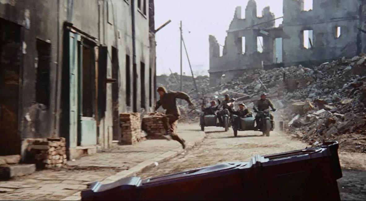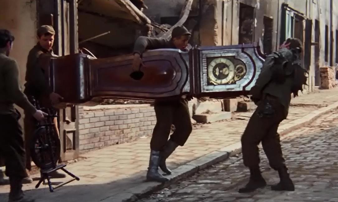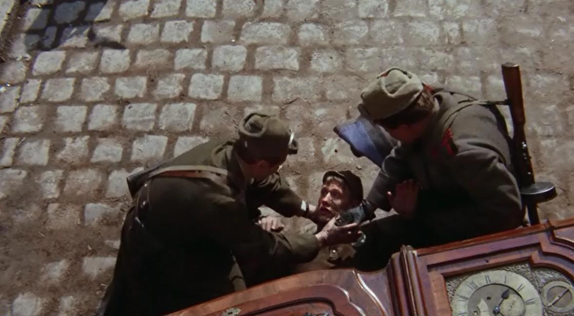 Так вот, русским там собственно минуты три посвящены близко к финалу. Герой вместе с другими пленными выгружает мебель из какого-то дома, башенные часы они там тащать почему-то. Вдруг кто-то страшно кричит "Русские!" и все разбегаются, а герой не успевает и падает на мостовую под весом башенных часов.