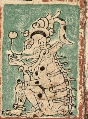 Бог А. Дрезденский кодекс. Череп. трупные пятна, выпирающие рёбра и хребет, гребень с мёртвыми глазами на голове. Ожерелье из мёртвых глаз.