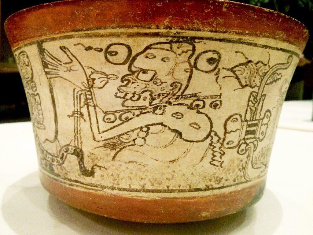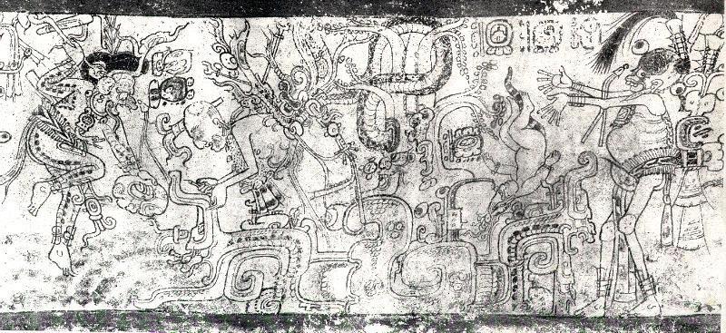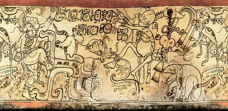 Бог А участвует в жертвоприношении малыша-ягуара. Изображение на сосуде классического периода.