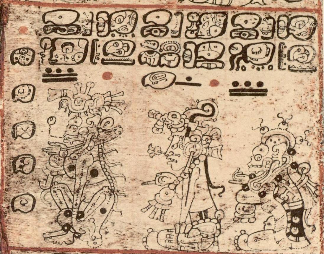 Боги А справа и слева. Дрезденский кодекс. Текст:  (Дни) 1 Хиш-Кими-Эц’наб-Ок-Ик’ I. Кружит Костлявый, хмель когда он вещает. 13 (дней до) 1 (числа). II. Кружит Хуун Ахав на пиру у щедрого (?). 26 (дней до) 1 (числа). III. Кружит Костлявый, смерть – его вещание. 13 (дней до) 1 (числа). Перевод В.Н. Талаха.