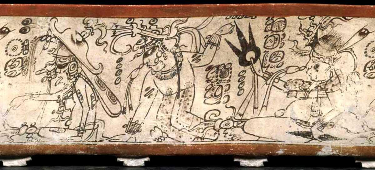 Акан, исторгающий рвоту с клизмой в руке. Чёрная полоска на глазах. Знак а’к’баль над глазами. Ожерелье из мёртвых глаз. Плащ со скрещенными костями. Прорисовка фрагмента сосуда классического периода K927.
