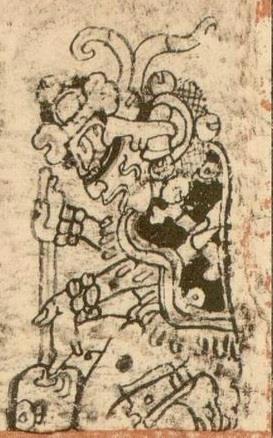 Бог А'. Дрезденский кодекс. Пучок волос. Большая кость в волосах. Знак а’к’баль над глазом. Чёрная полоса на глазах. Плащ с черепом и скрещенными костями.