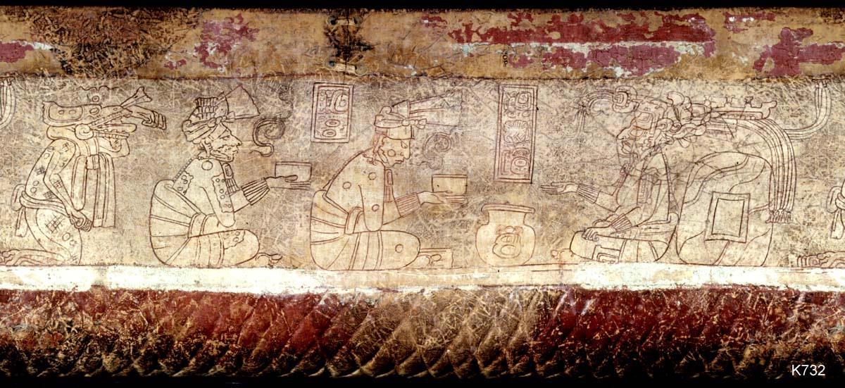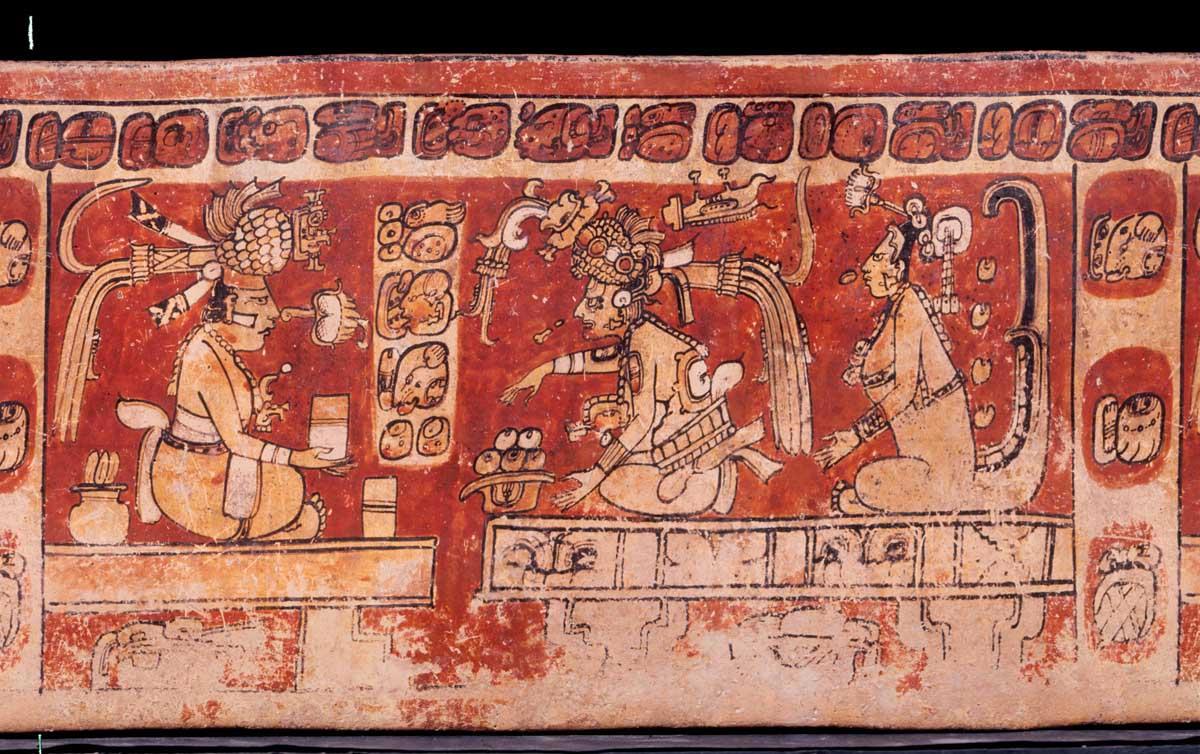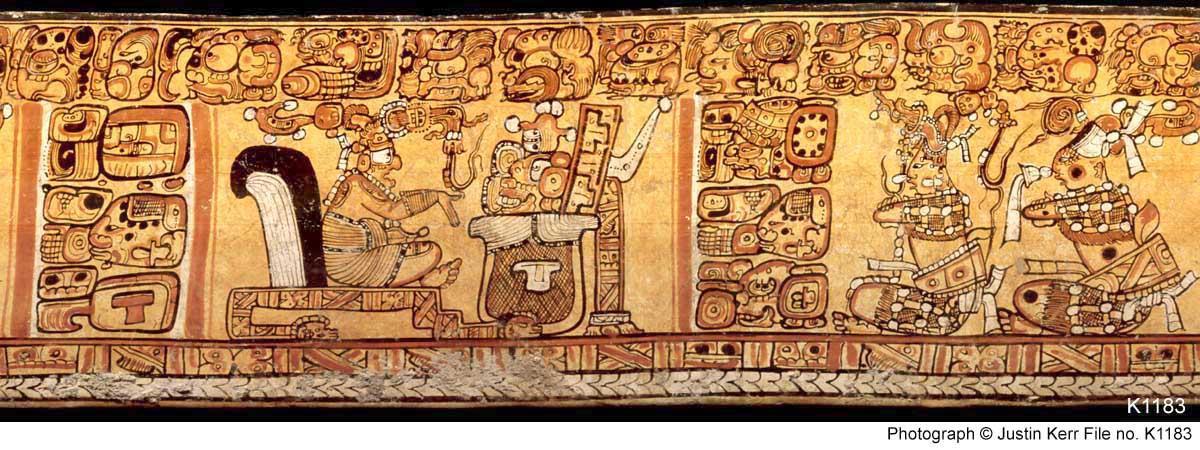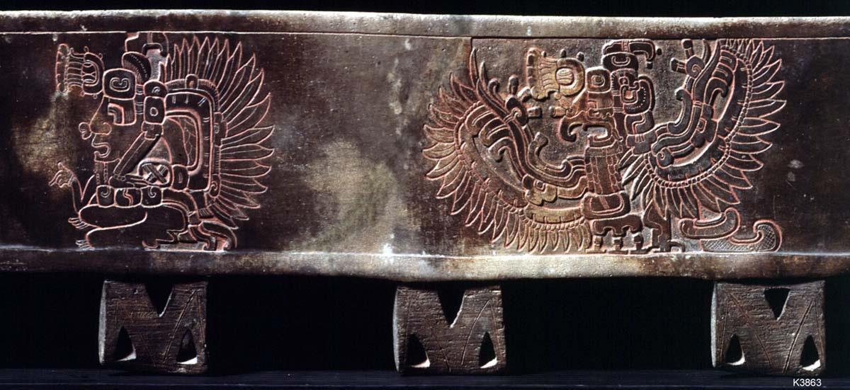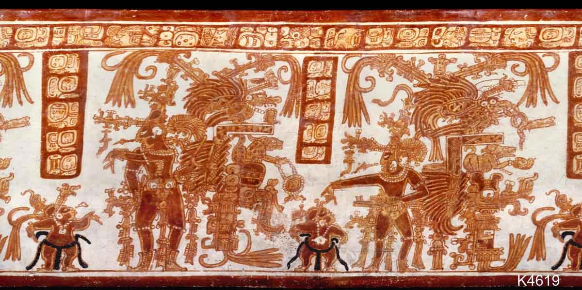 Бог маиса танцует с карликом. Над ним птичье божество.