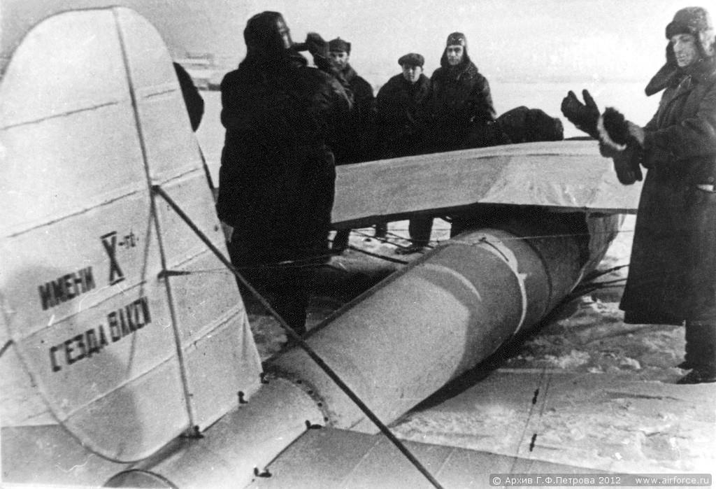 Но работа между тем продолжалась. Уже под руководством Ивана Васильевича Титова был изготовлен надувной планер-летающая лодка «Имени Х съезда ВЛКСМ». Толковых фотографий тоже нашлось, но кое-что про него известно. Это был одноместный надувной высокоплан (что не удивительно для летающей лодки). Конструкция была комбинированная. Вес – 77 кг. Время подготовки к полёту – 20 минут. В собранном виде планер укладывался в сумку размерами метр на метр на полметра. Ещё есть вот такая фотография из архива Петрова: