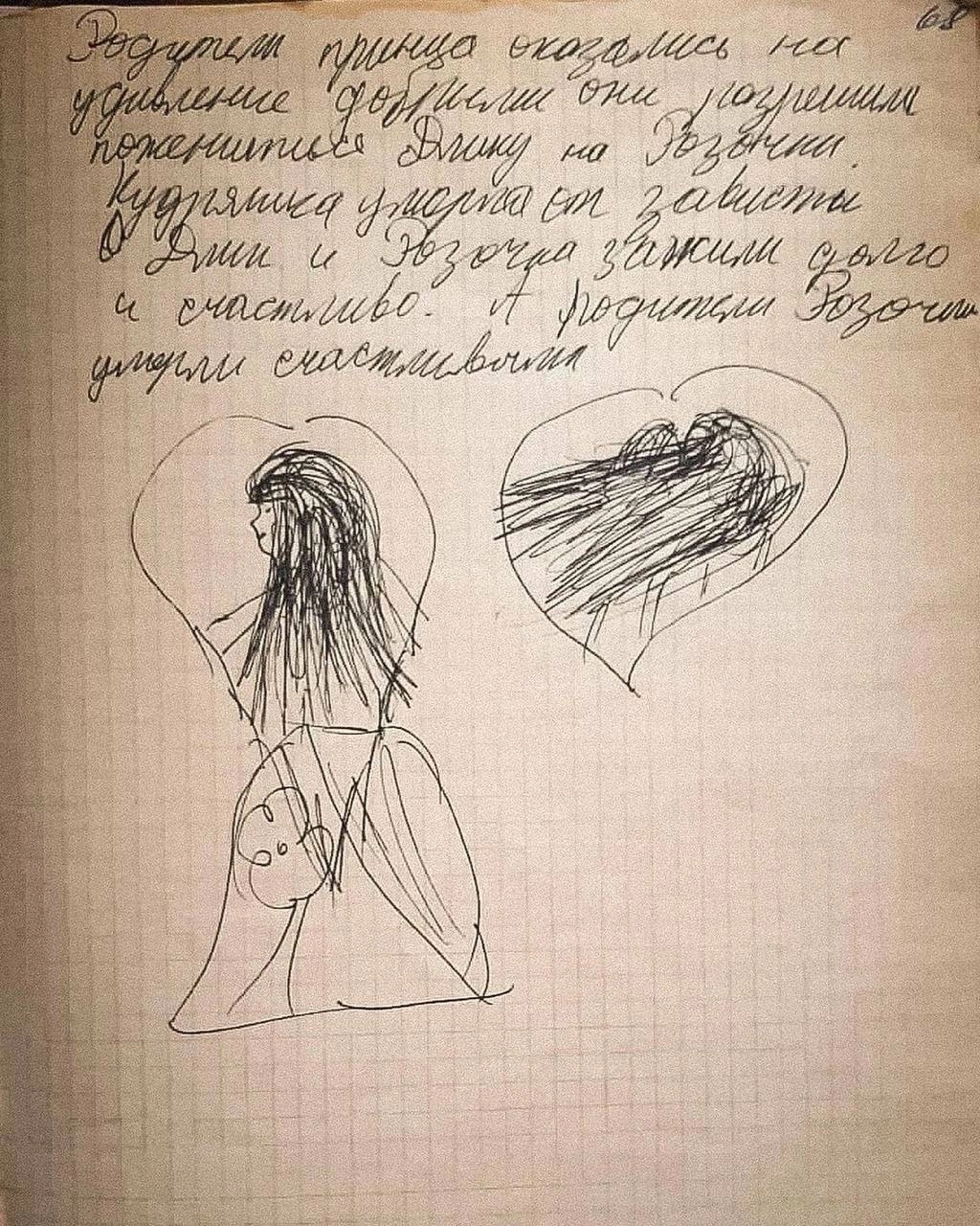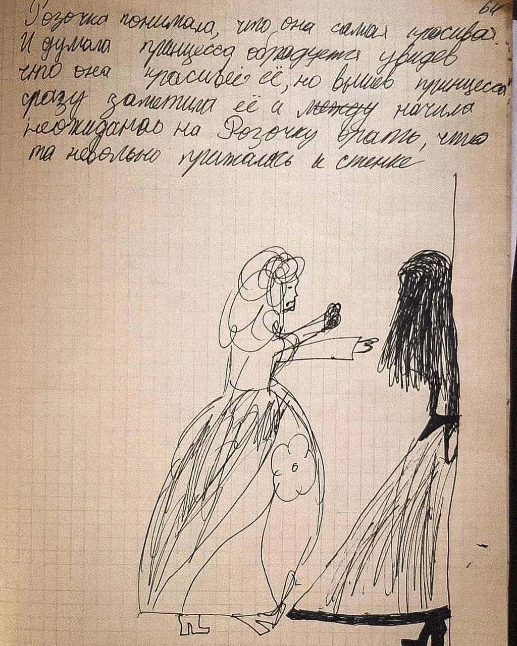 Но принцесса сразу заметила ее и между (зачеркнуто) [что же 10летняя Марина хотела сказать?] начала неожиданно на неё орать, что та [Розочка, судя по картинке] невольно прижалась к стене [Почему у Розочки поверх юбки трусы? А у принцессы оторвана кисть руки?].