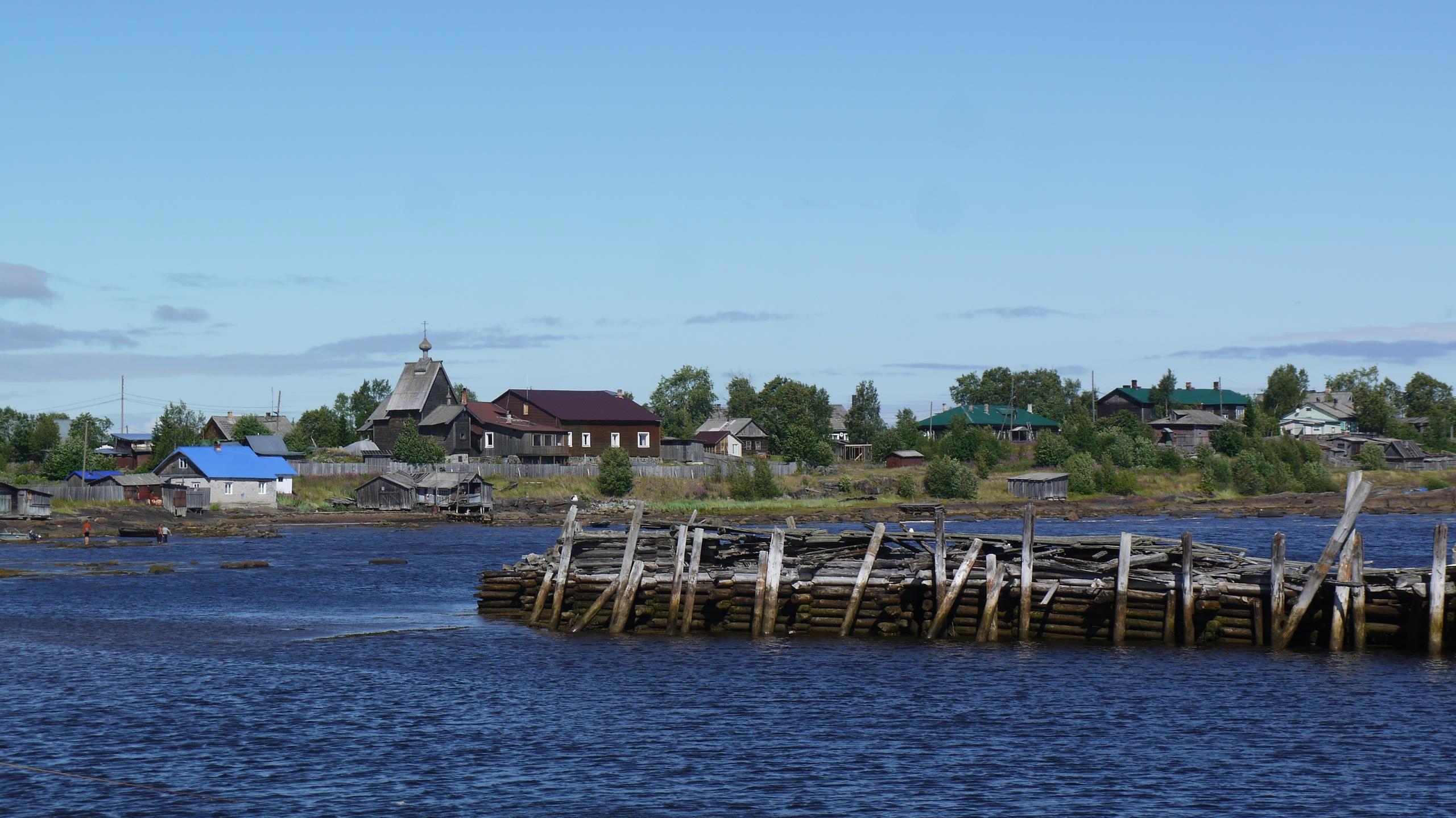 Посёлок Рабочеостровск около Кеми. Берег Белого моря. Видно подворье Соловецкогом монастыря.