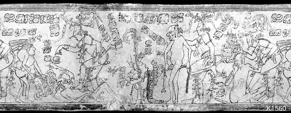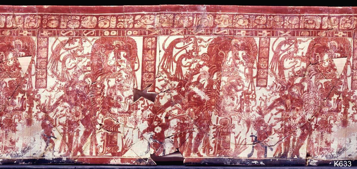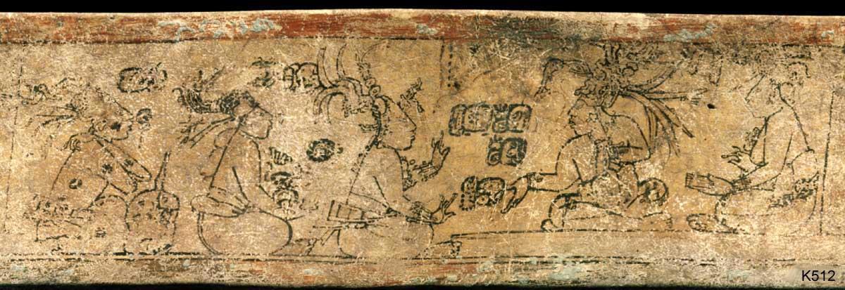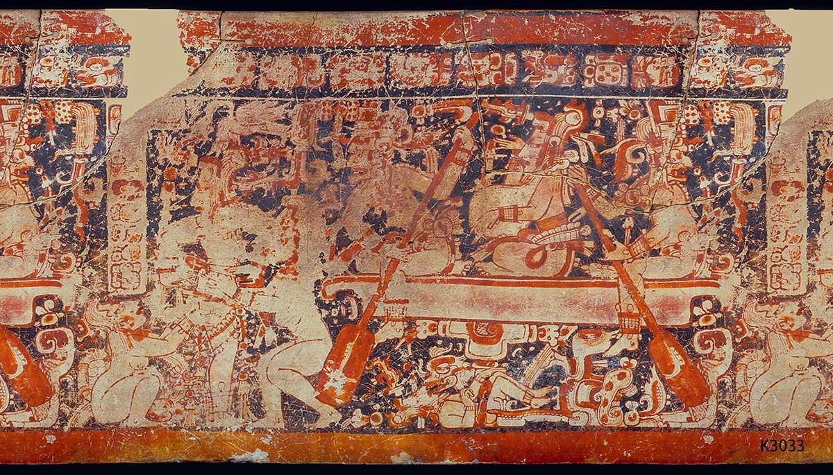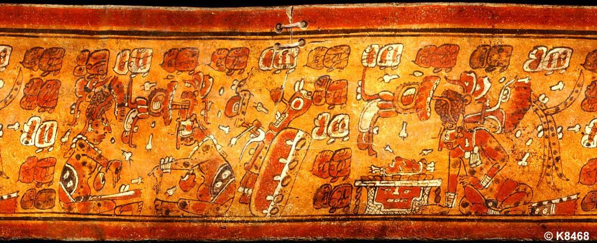 Слева облачение бога маиса. Голые женщины одевают бога. Справа боги-гребцы везут бога маиса по водам иного мира. Под лодкой бог маиса в воде его клюют рыбы и пожирает чудовище.