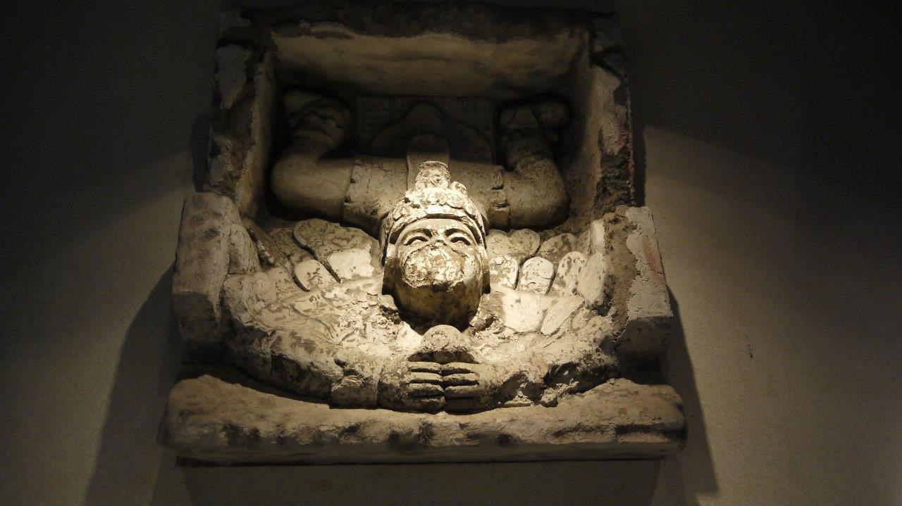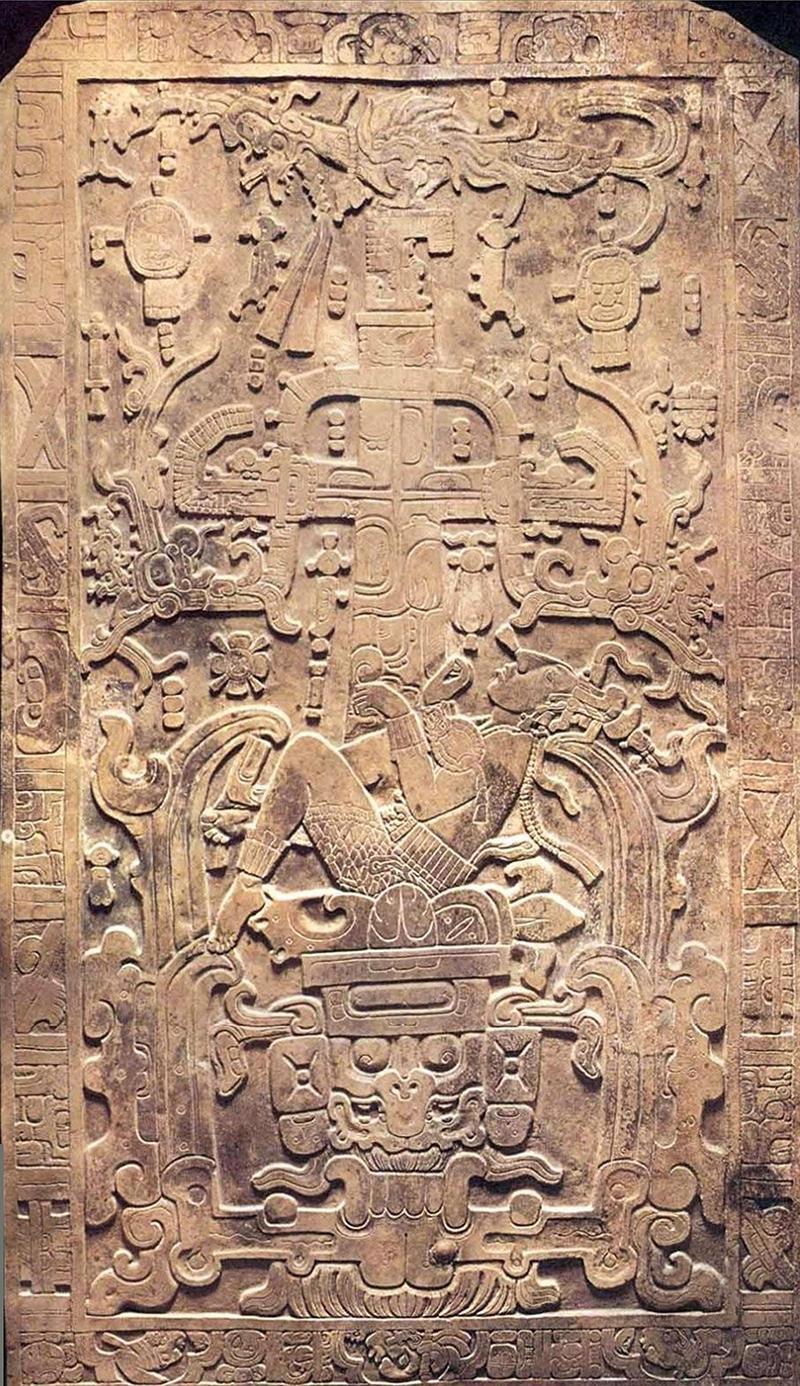 Крышка саркофага Кинич-Ханааб-Пакаля, правителя города Лакам Ха (Паленке). Кинич-Ханааб-Пакаль воскресает в виде бога маиса.