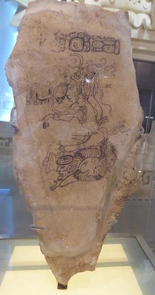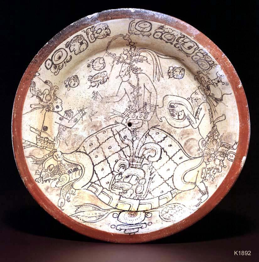 Панцирь черепахи треснул. Из него выходит бог маиса с удлинённой головой и листьями, растущими из неё. Символ прорастания зерна.