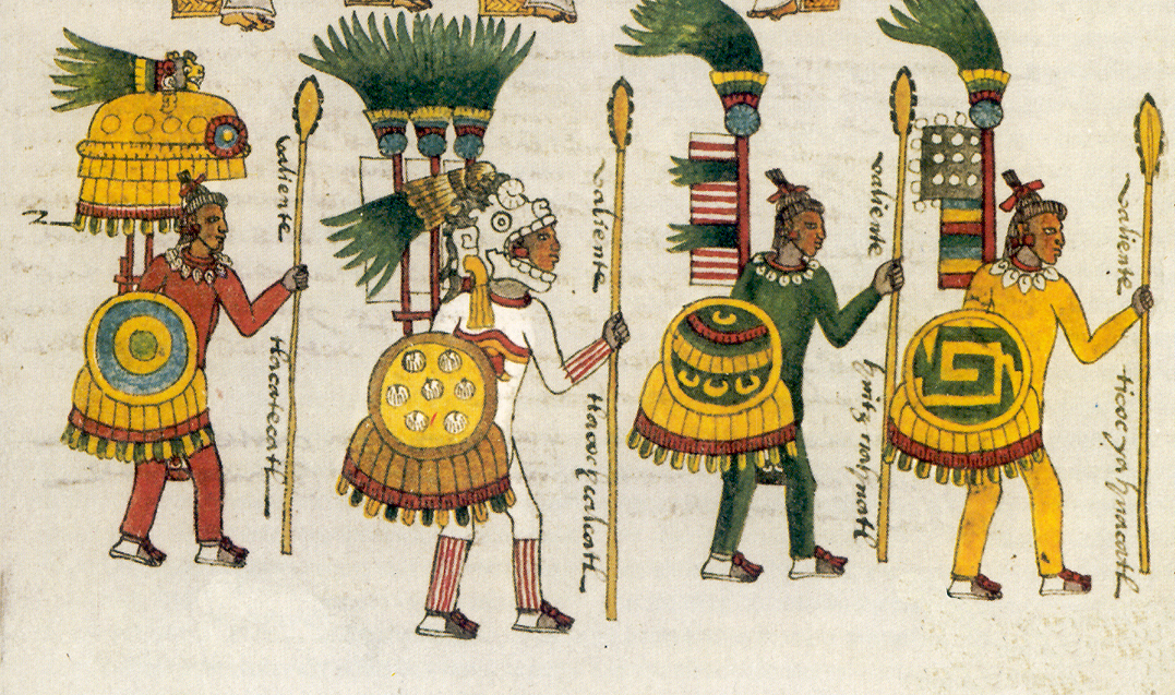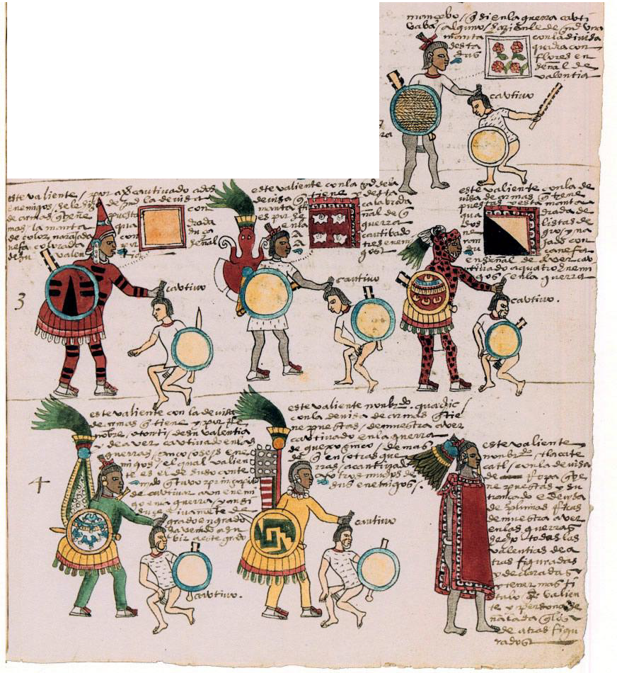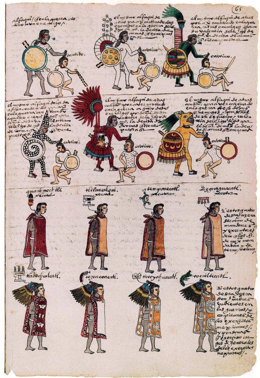 В кодексе Мендоса показаны военные костюмы, щиты и плащи, соответствующие статусу каждого воина, указаны заслуги, за которые они даются.