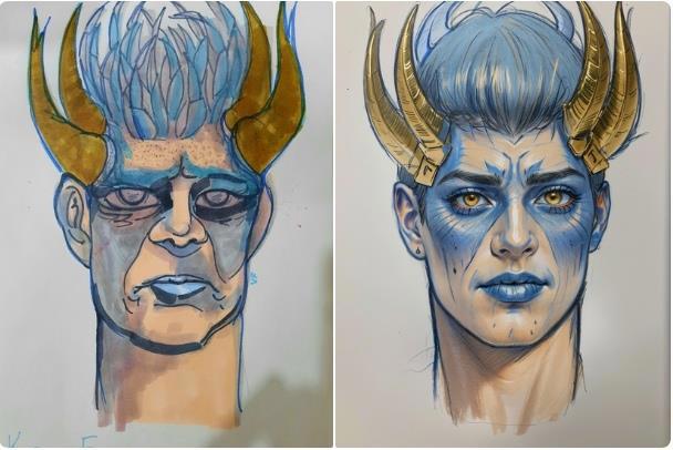 Первый арт - скетч от руки. Второй - прогонка моего арта через модель в сетке диффузия.