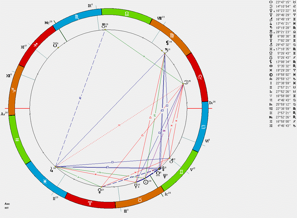 Для примера возьмём булгаковский роман "Мастер и Маргарита", ибо знают его все. Вот натальная карта М.А. Булгакова: