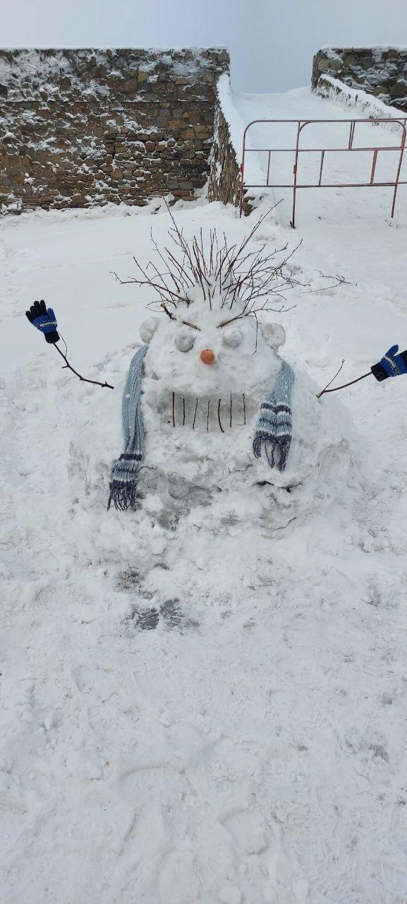 А сегодня было не очень тепло, но и не очень холодно - всего -7, на крепости может быть даже немного холоднее. Но дело в том, что снег не лип вообще, скатать что-то было невозможно! Участникам вынесли несколько ведер воды, но до нас с Леной эта вода так и не дошла, поэтому мы быстро сообразили ломать наст... благо наст сантиметров 20 после всех оттепелей, что были до этого. Ломали наст и складывали кирпичиками. Да, мы не лепили снеговика, а строили 😂 Поэтому он у нас немного неровный получился и не по канонам, но, на наш с Леной взгляд, очень даже милый 😊