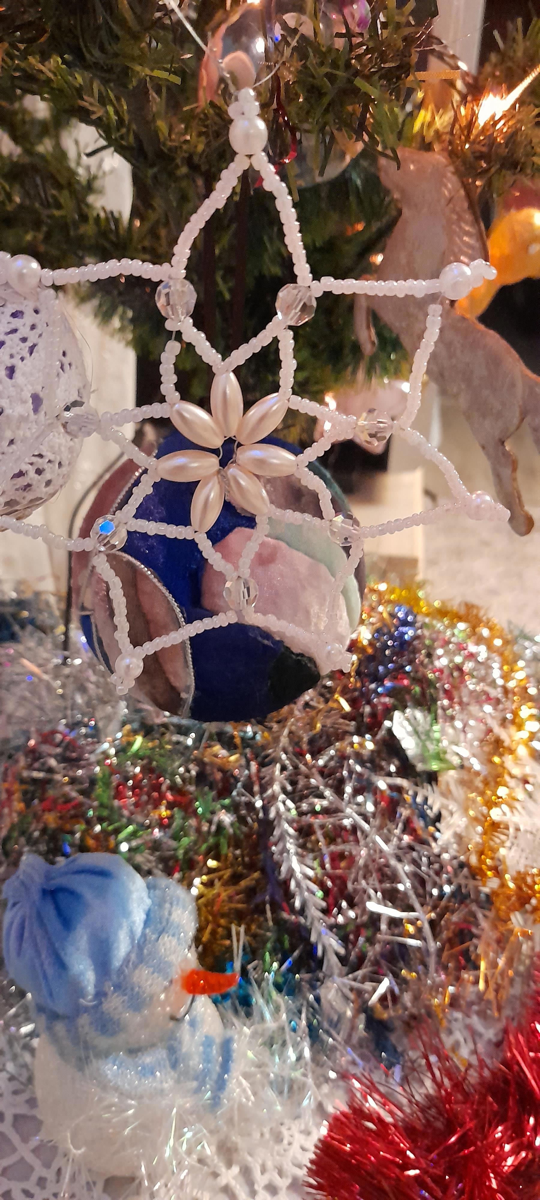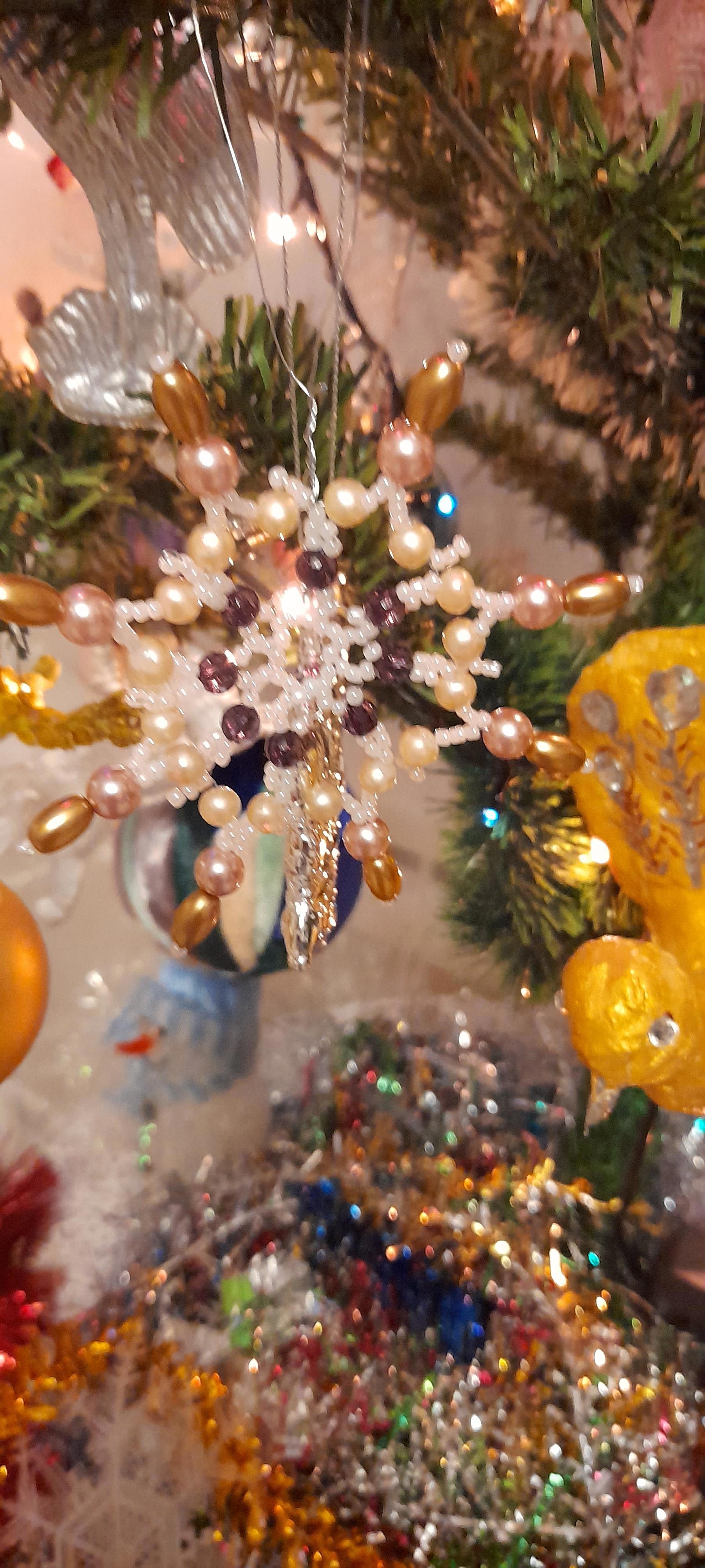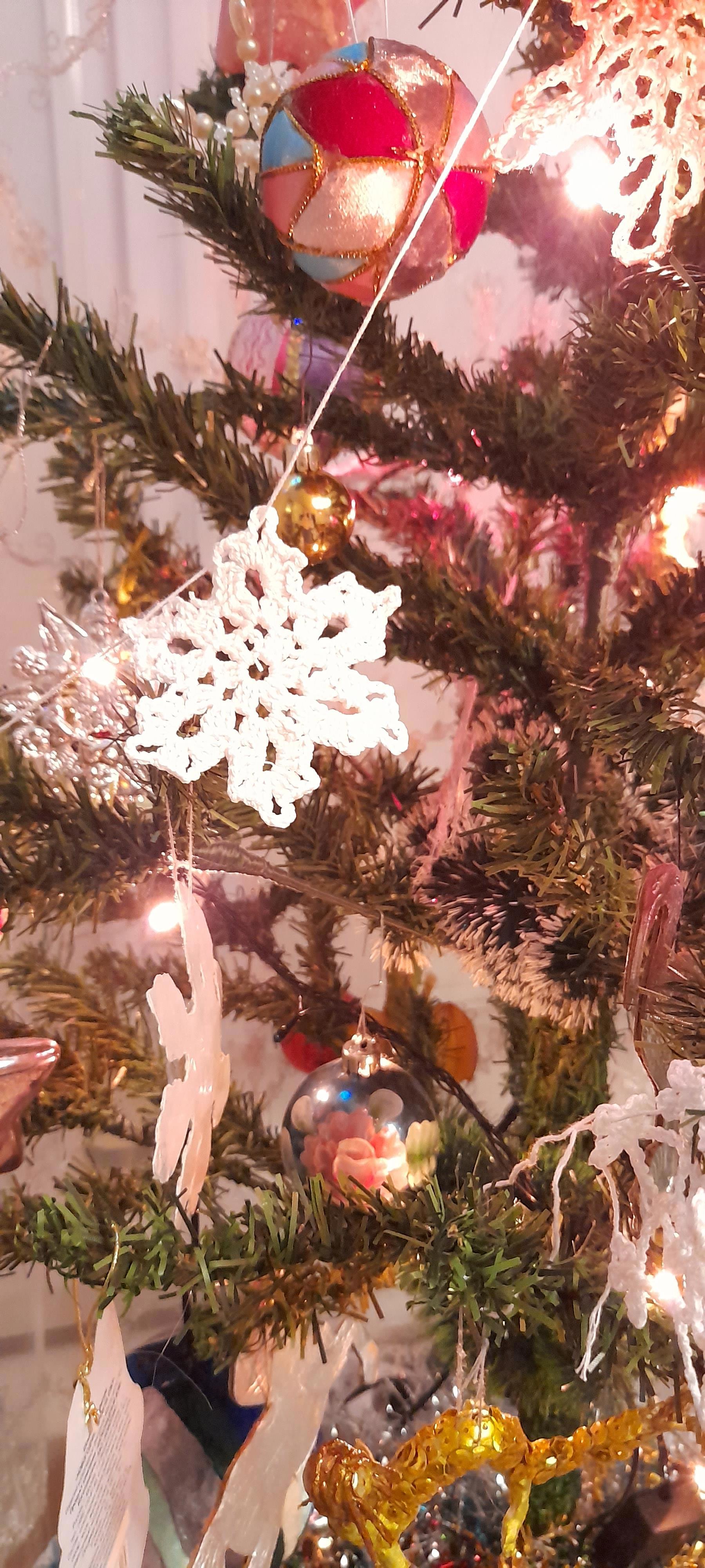 Собственно, ничего уникального в ней нет. Она ничем не отличается от прошлогодней, кроме гирлянды из самовязаных снежинок и парочки бисеро-бусинных.