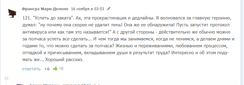 А ещё огромное спасибо Франсуа Мари Делоне, давшему короткий отзыв на каждый из 218 участвовавших рассказов, в том числе и на мой. Не каждый способен на такой подвиг, а ведь авторам это так важно - знать, что твой рассказ прочитали.