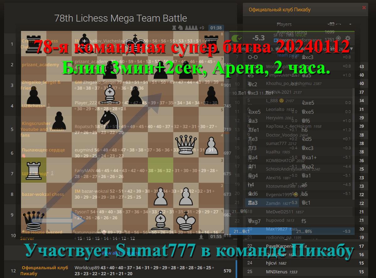 Автор: Константин ОборотовВ пятницу вечером, 12.01.2024 прошел традиционный командный международный шахматный турнир на платформе ЛиЧесс под названием "78th Lichess Mega Team Battle". Главный администратор и организатор турнира LuisAlce (Испания). Система Арена, контроль блиц 3+2, работают берсеки и премии за серии побед. Приняло участие 194 команды, 3141 участников. В зачет идут результаты 20-ти лучших игроков каждой команды. В этом турнире впервые приняла участие команда универсальной популярной социальной сети "Пикабу", которая в результате заняла достойное для новичка 12-ое место. За команду "Пикабу" играл я, Sumat777.