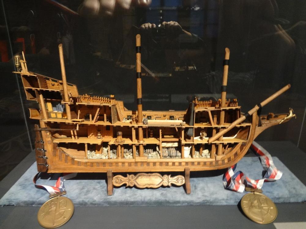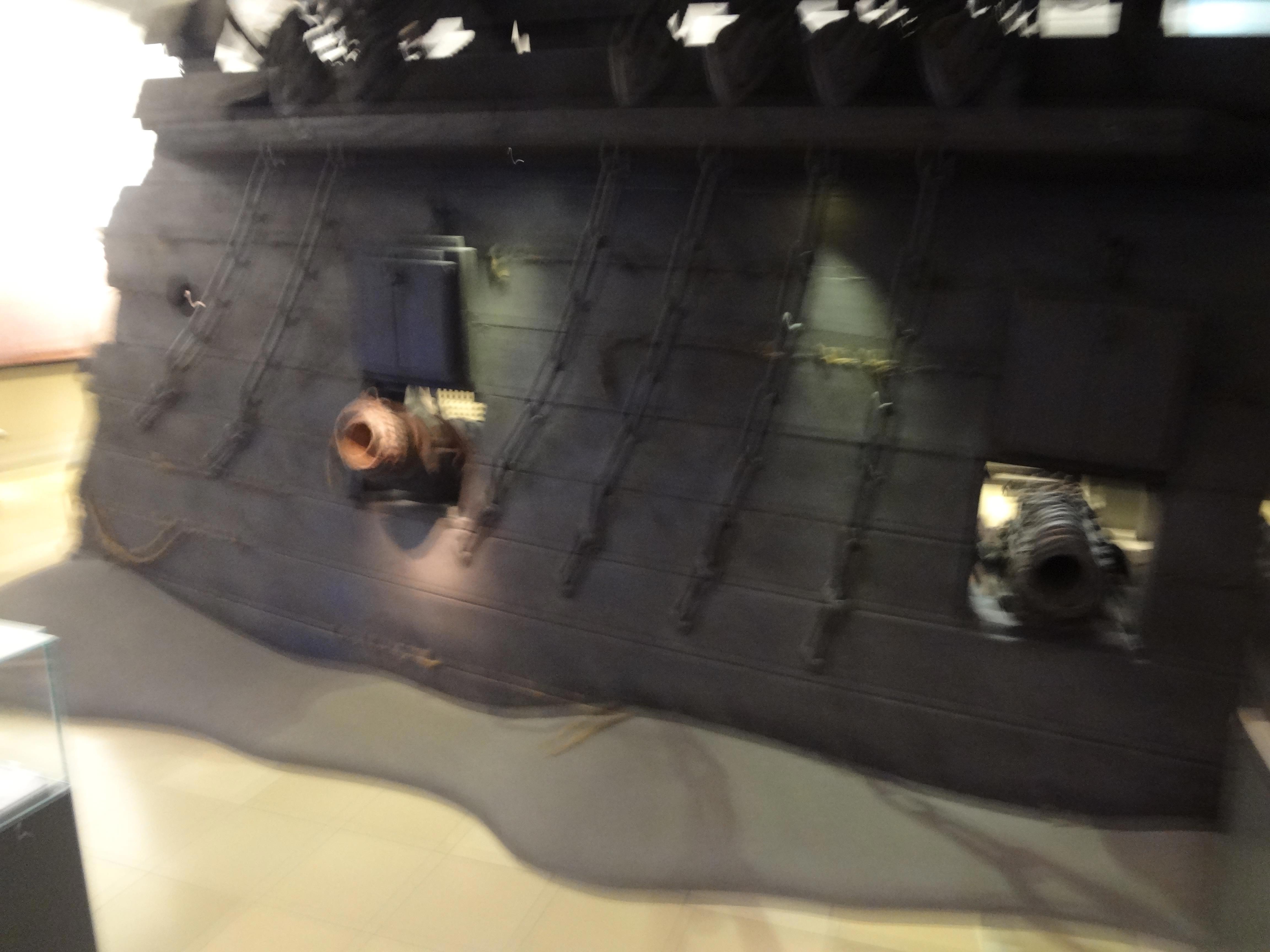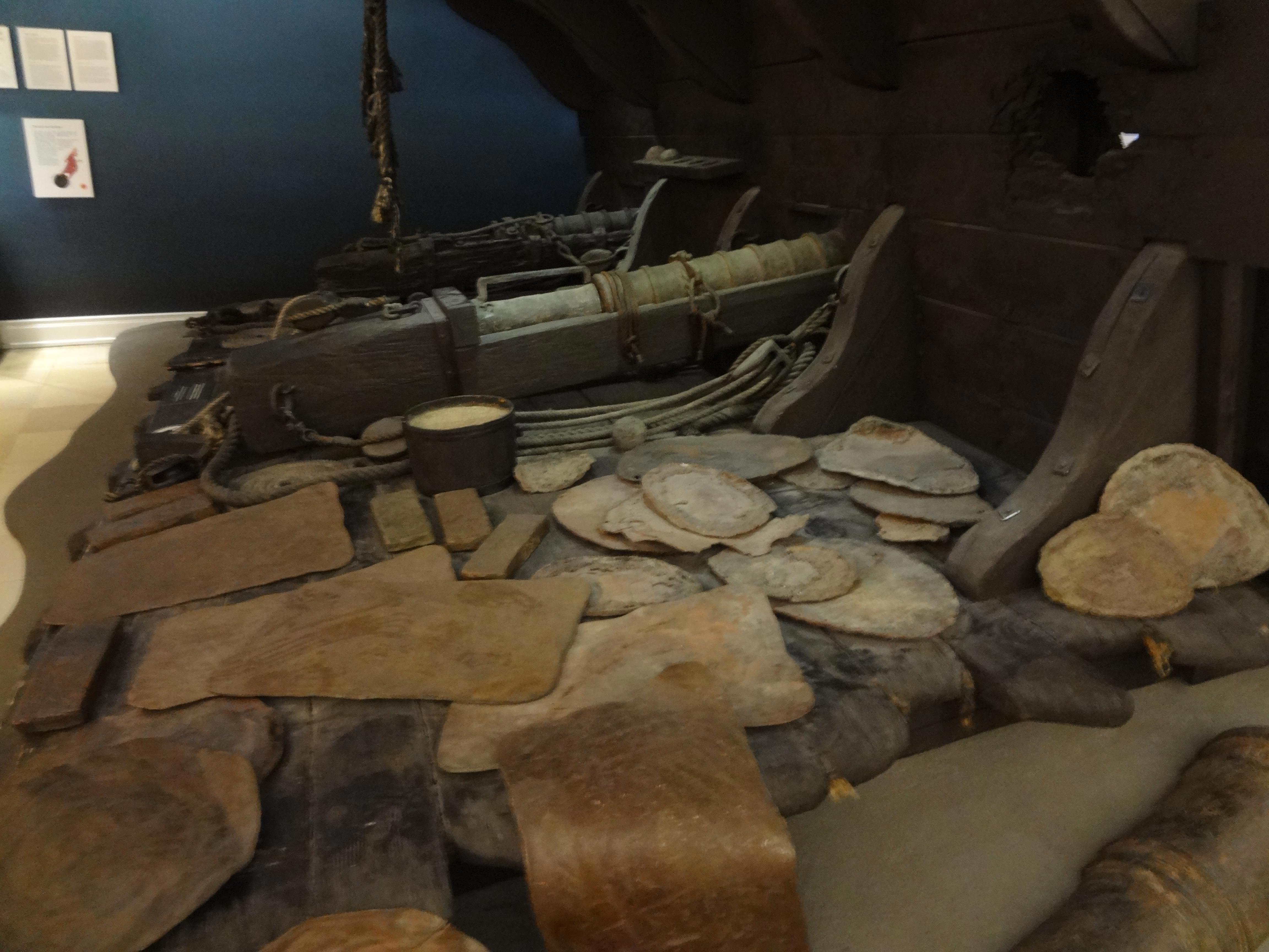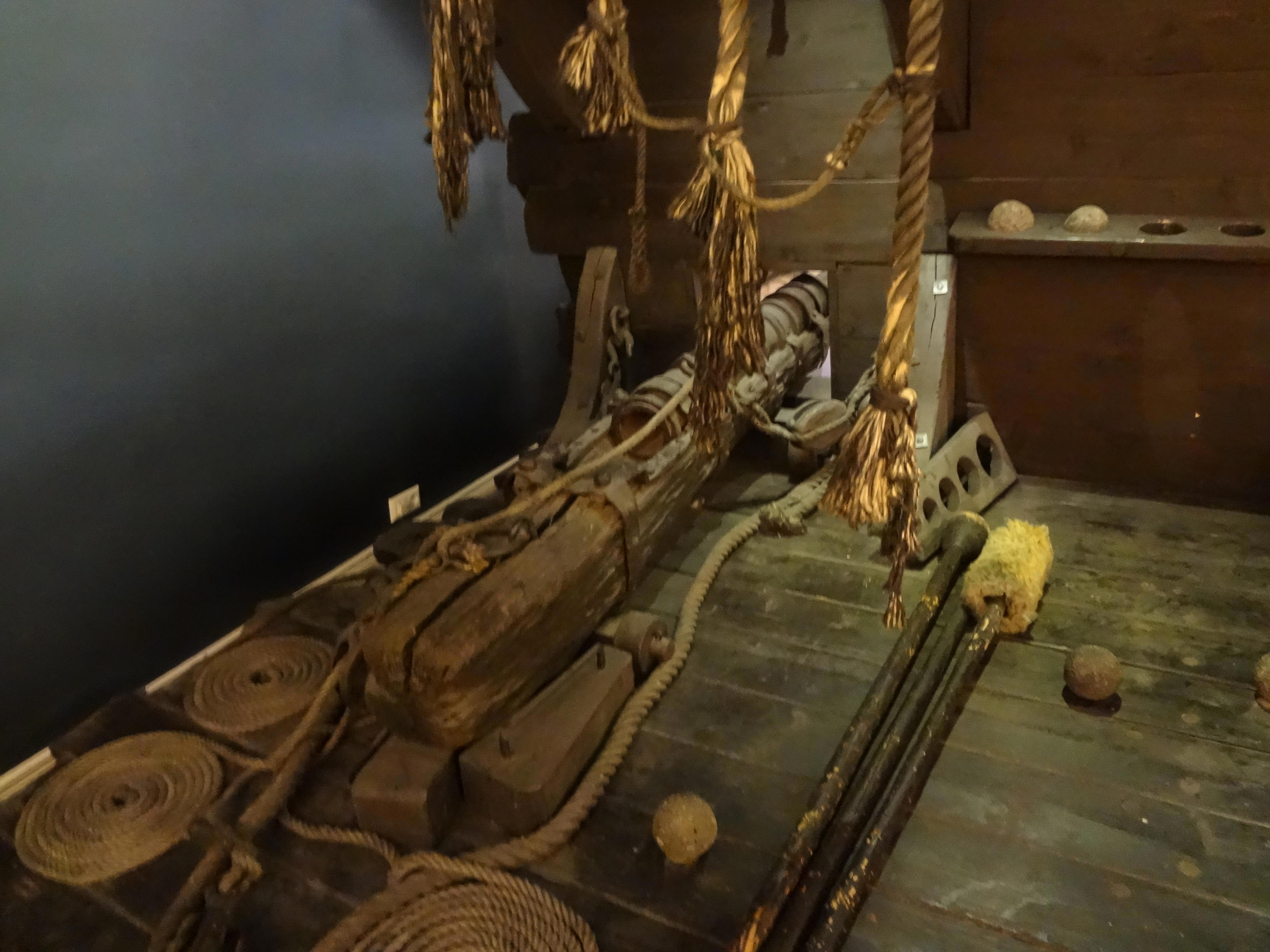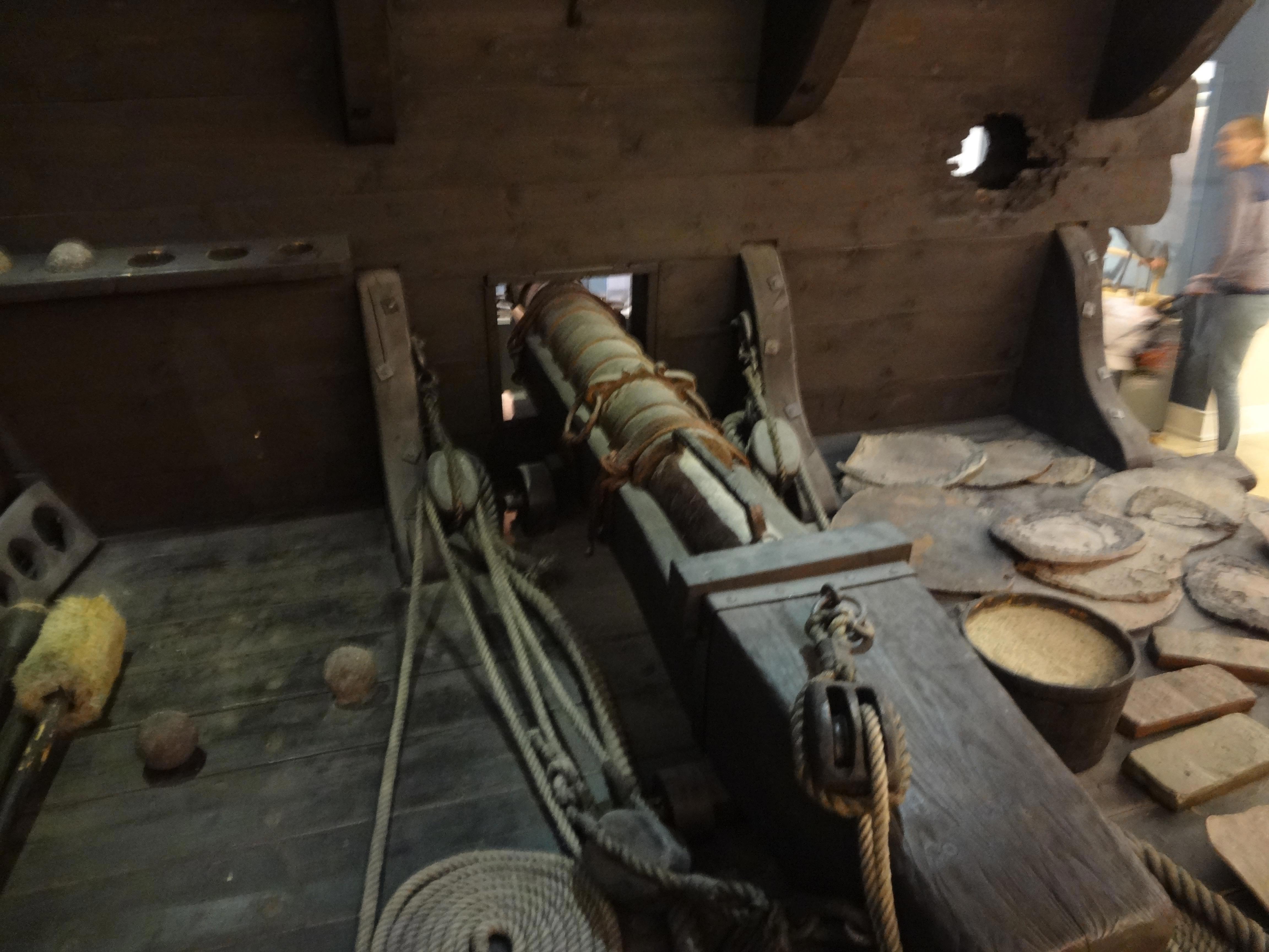 Орудийное место  для стрельбы в отверстие фальшборта. Казнозарядная пушка морская со всей положенной к орудию принадлежностью. Слева банник и калибровочные доски, ядра. Справа - клинья для наводки по вертикали. Ведро с песком. Выше и правее в борту дыра от вражеского ядра.