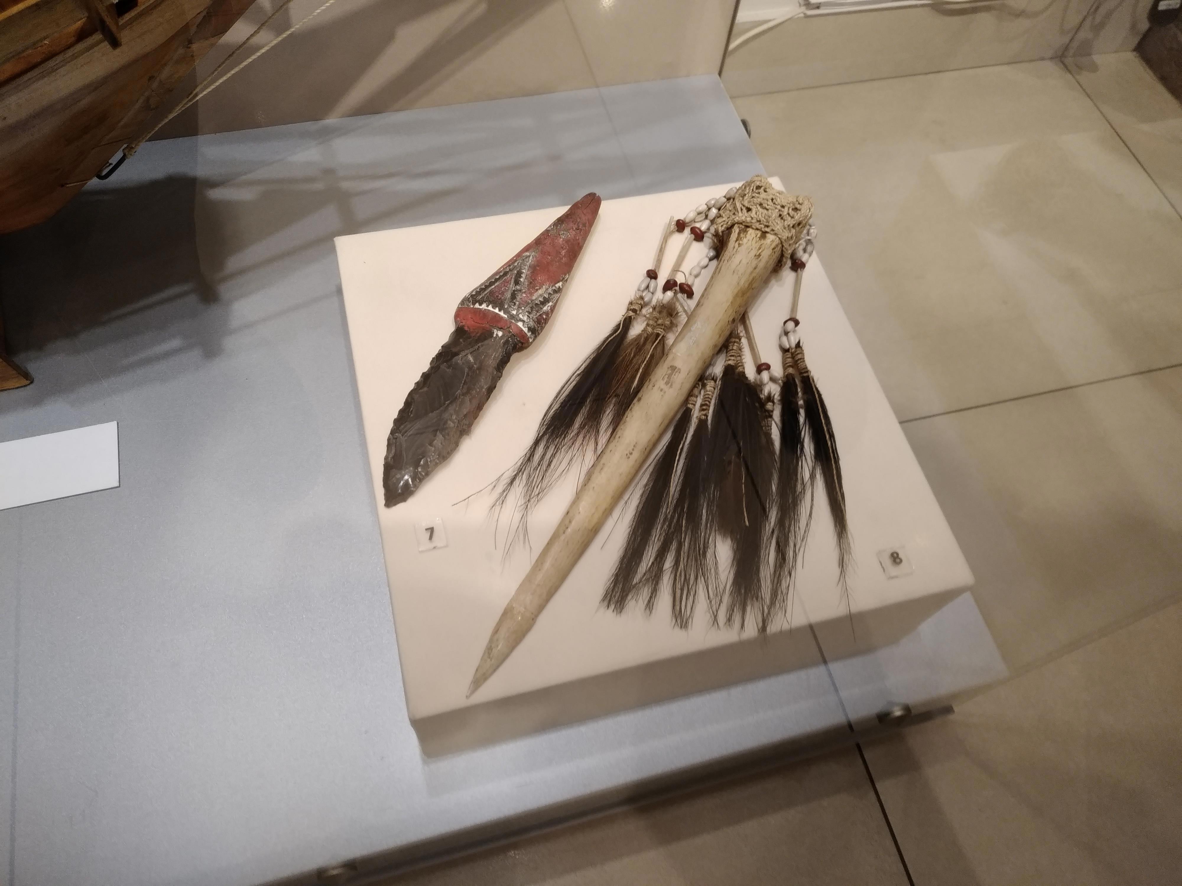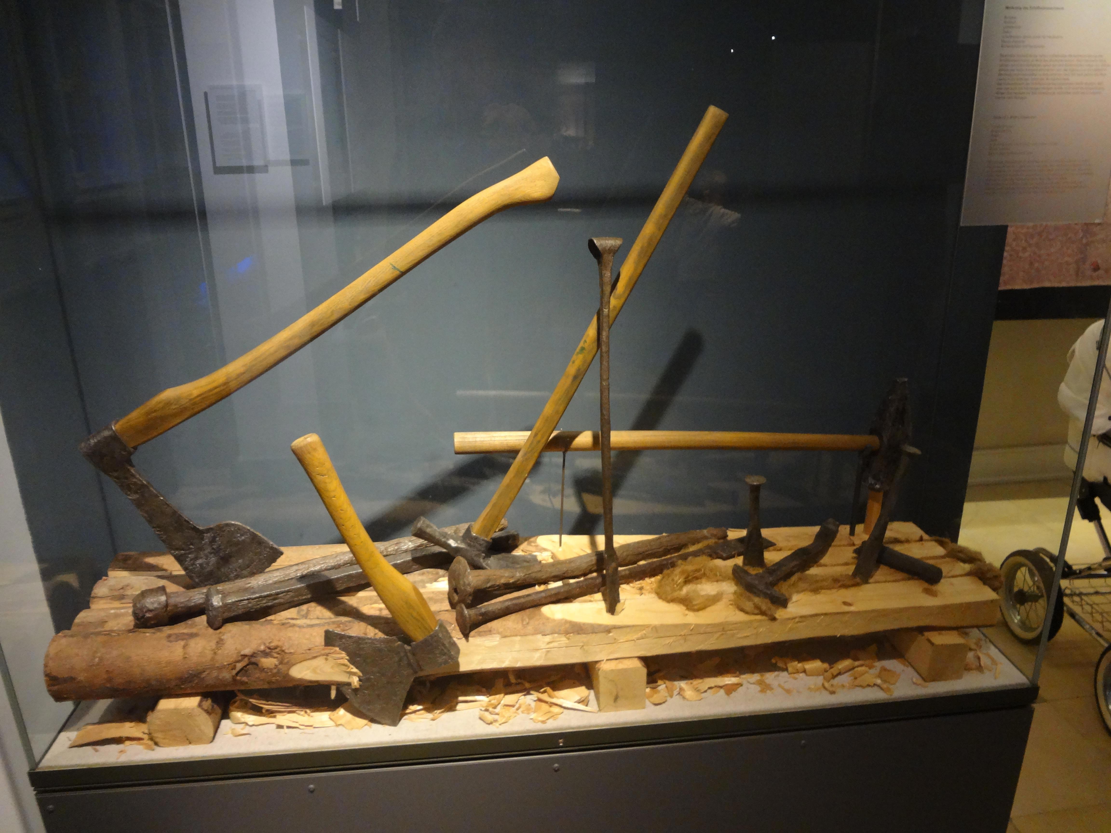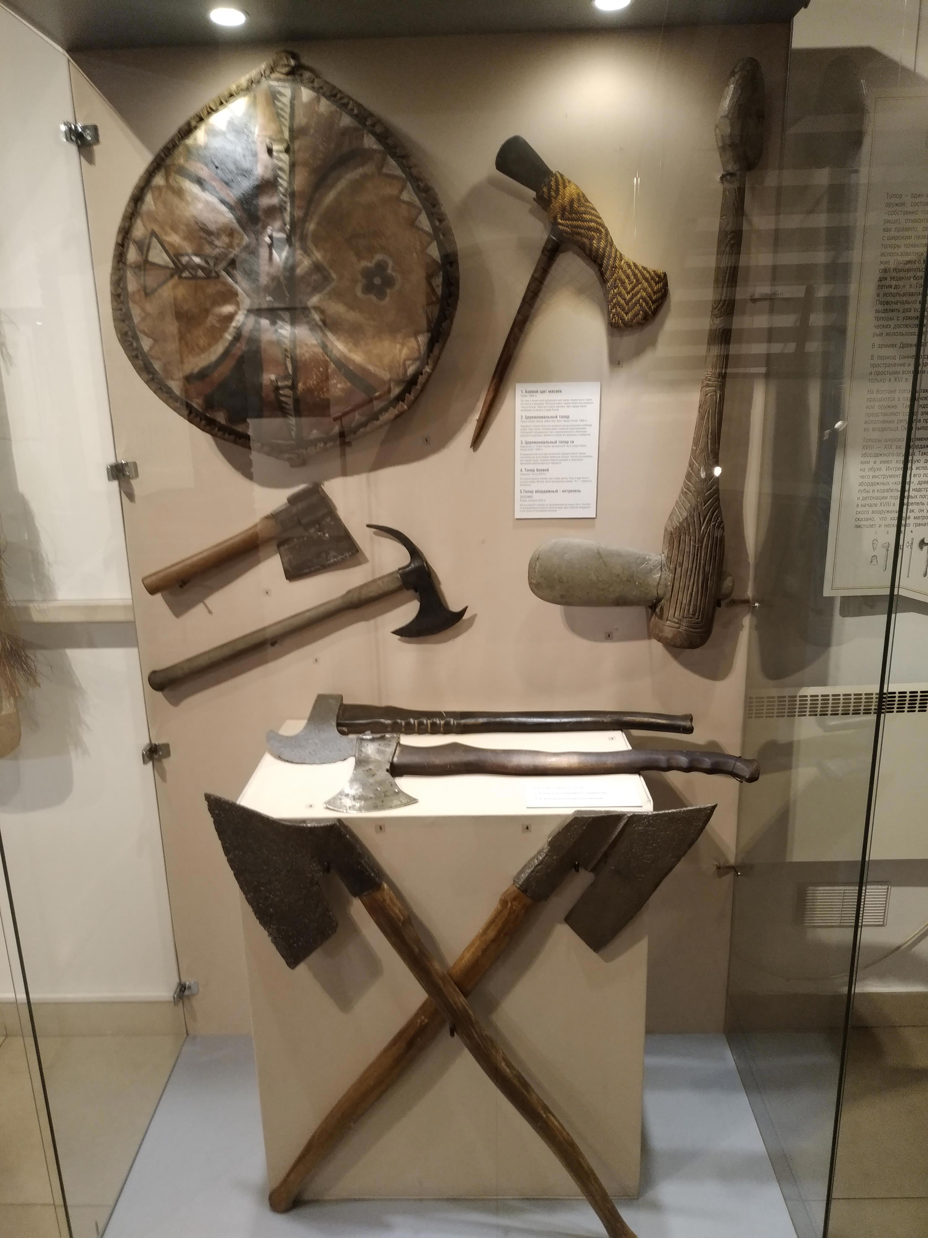 Пиратство и абордажи родились вместе с мореплаванием. Наверху щит и пара каменных топоров - ниже более поздние. Жуткого вида секиры в самом низу - обозначены как плотницкий инструмент двойного назначения, что удивило.
