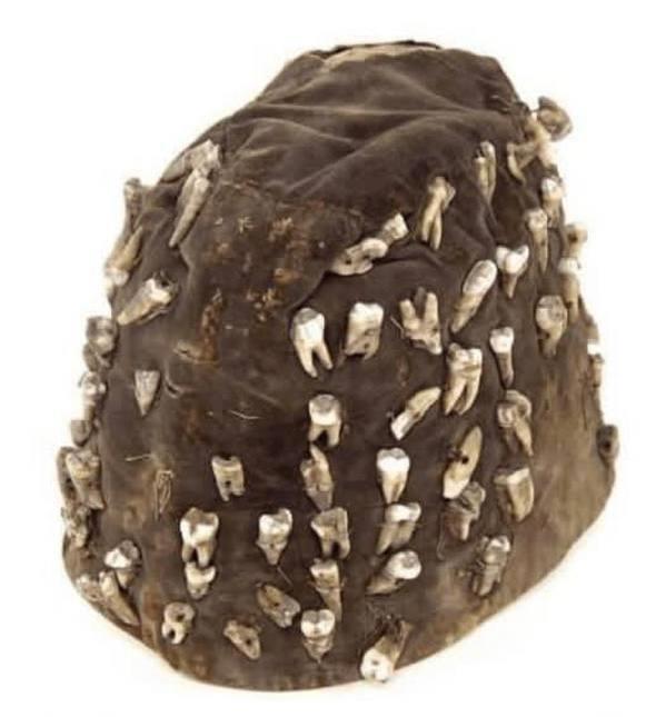 На шапку нашиты зубы. Аккуратно просверленные для этого.