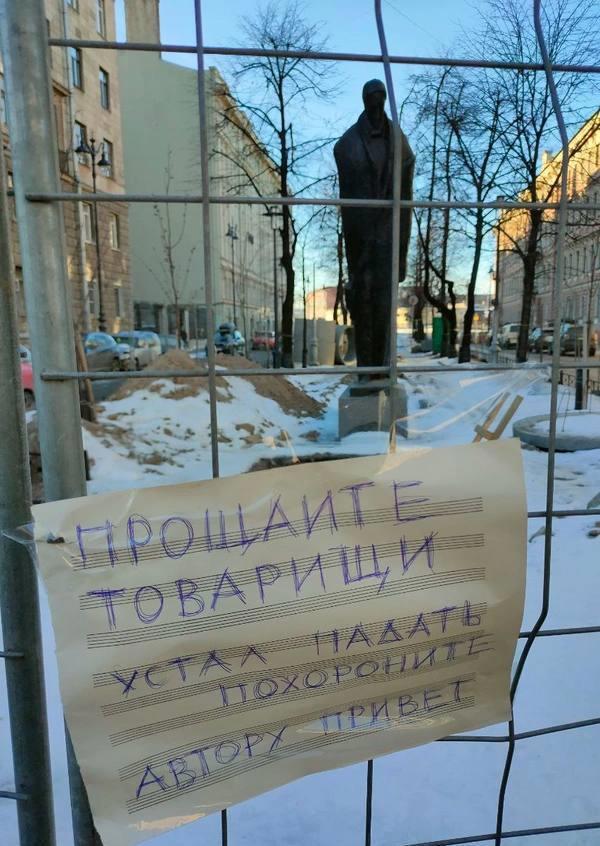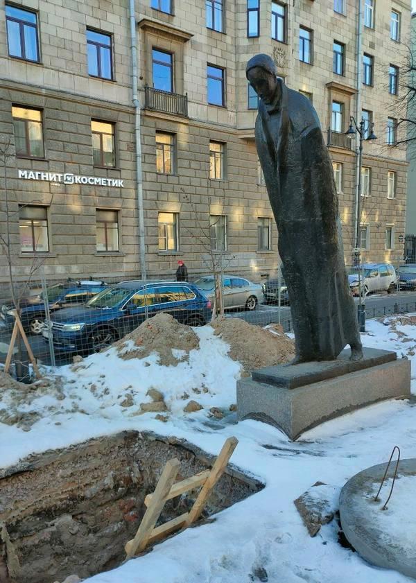 Ремонт у идиотского памятника Блоку. (Халтурная болванка, установленная на манер Пизанской башни, с наклоном)