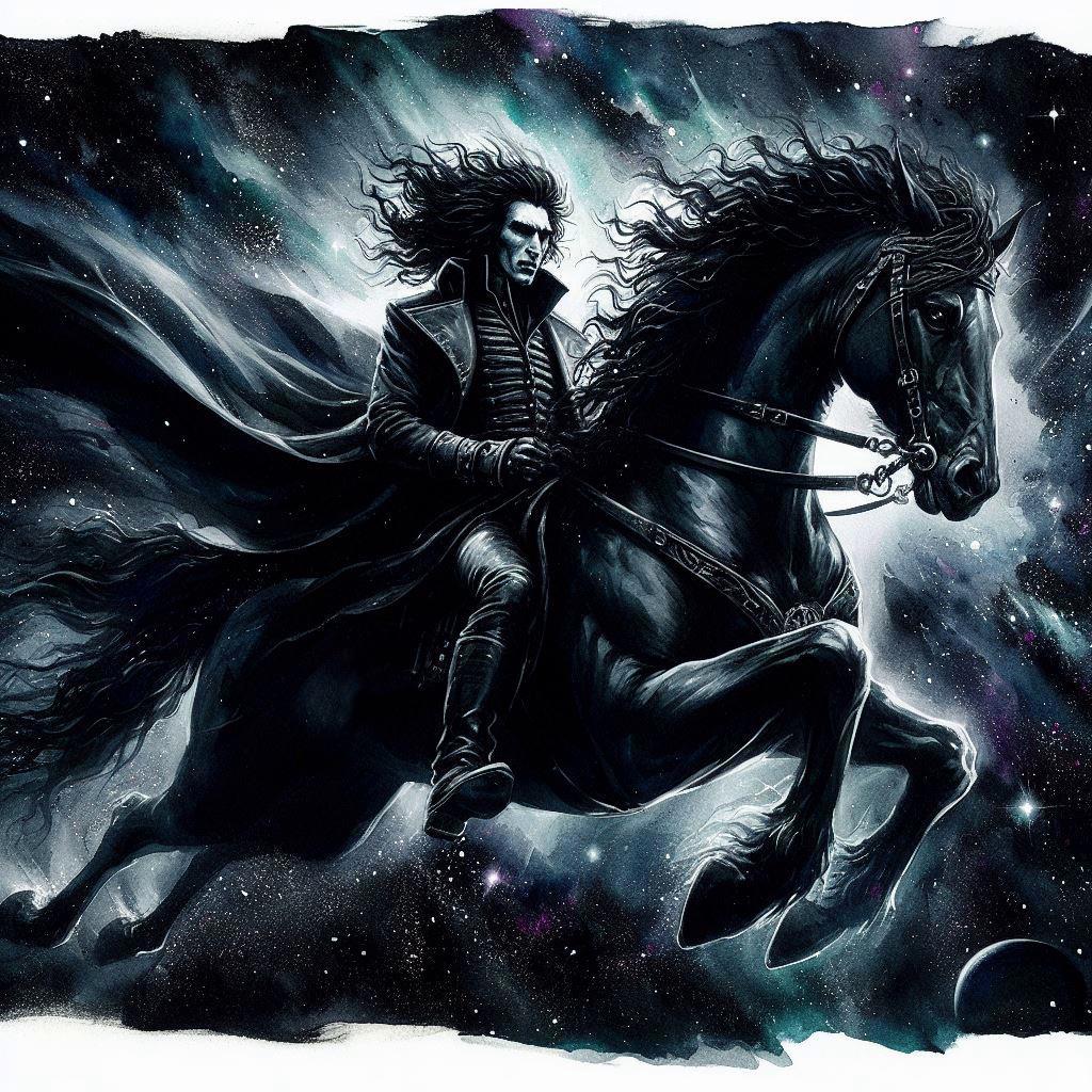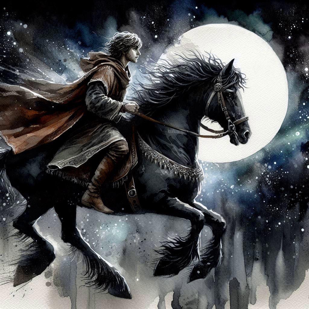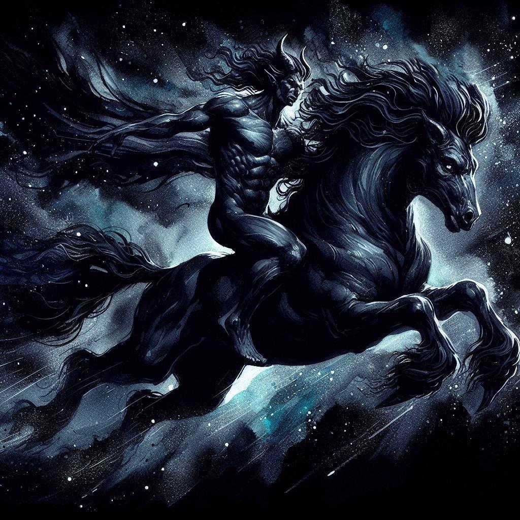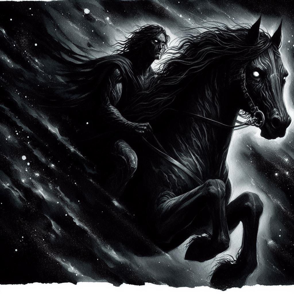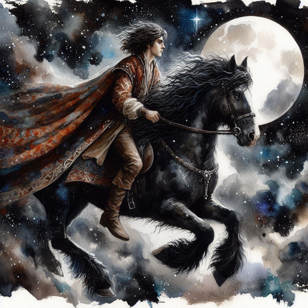 И, наконец, Воланд летел тоже в своем настоящем обличье. Маргарита не могла бы сказать, из чего сделан повод его коня, и думала, что возможно, что это лунные цепочки, и самый конь — только глыба мрака, и грива этого коня — туча, а шпоры всадника — белые пятна звезд.