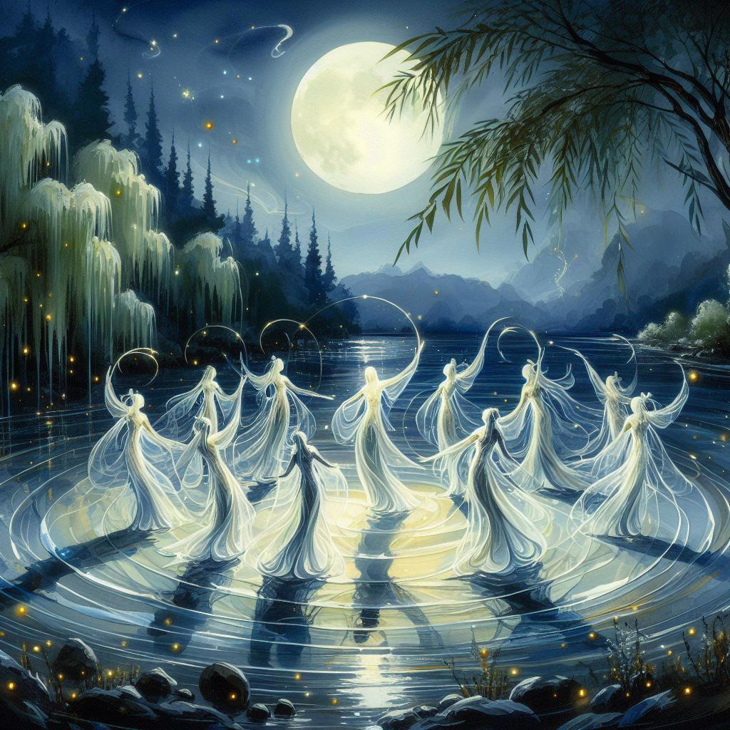 Под ветвями верб, усеянными нежными, пушистыми сережками, видными в луне, сидели в два ряда толстомордые лягушки и, раздуваясь как резиновые, играли на деревянных дудочках бравурный марш.