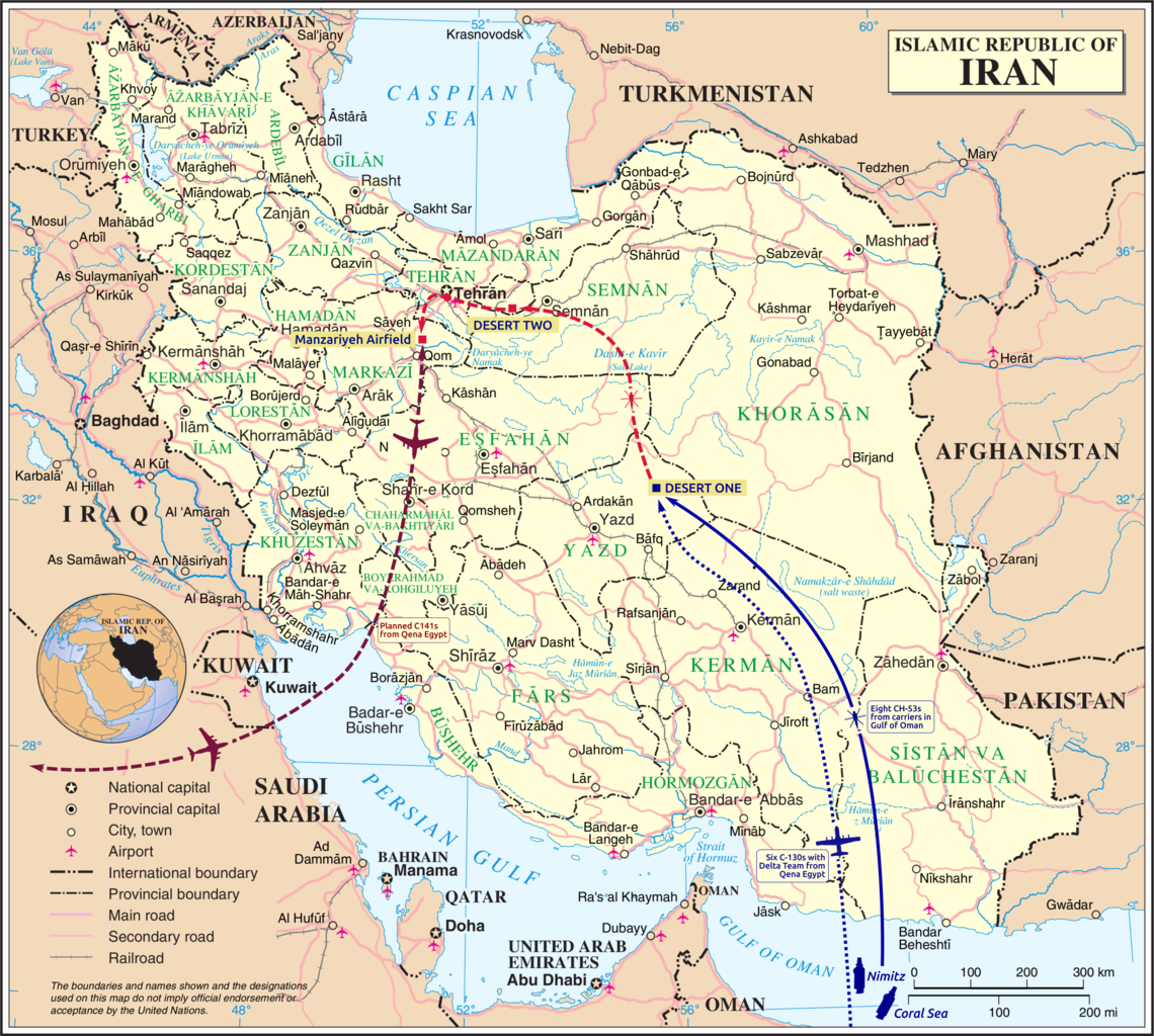 — вертолеты RH-53D и транспортные самолеты С-130 по разным маршрутам прибывают на точку Desert One (ровный солончак в 320 км к ЮВ от Тегерана);