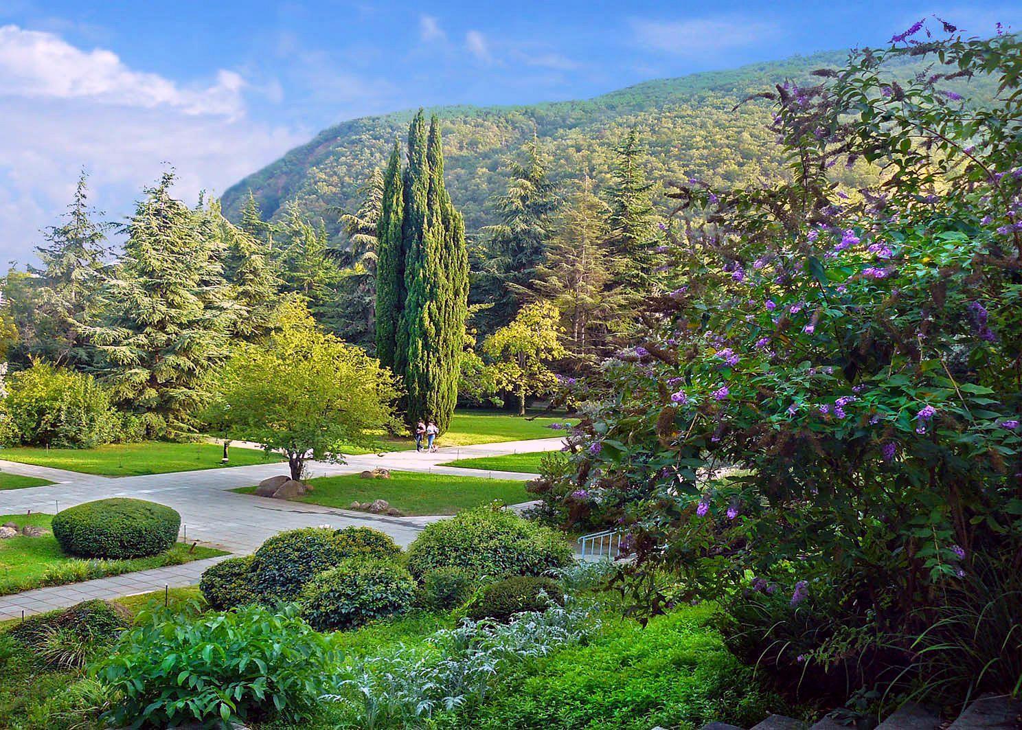 Это парк военного санатория "Крым" в Партените (посторонних пускают только за деньги), на заднем плане - Аю-Даг, куда ходили в туристический поход главгеры, и где Настя пугала Шишкина: