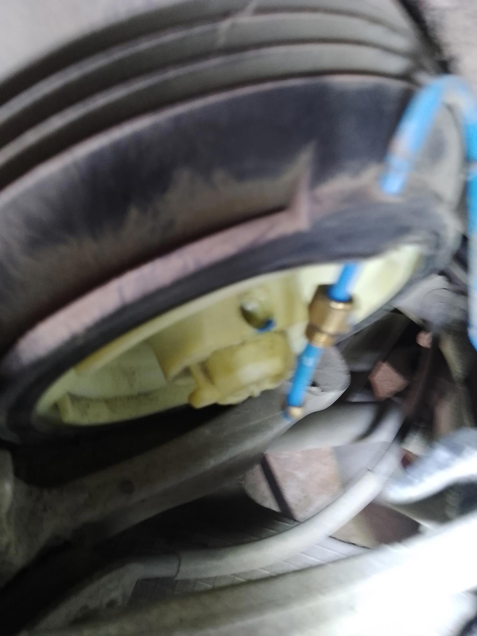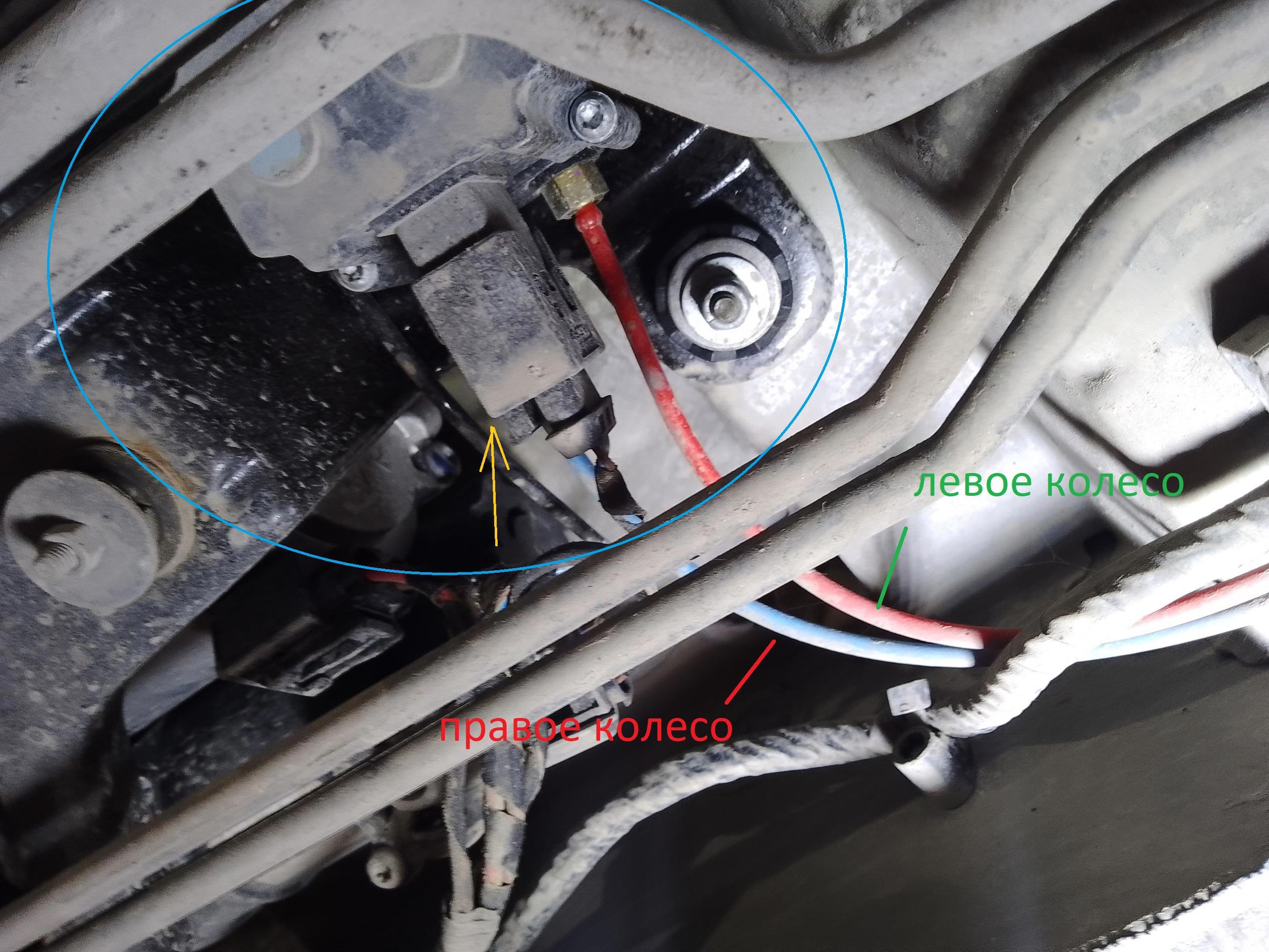 А вот и наш электроклапан. Отключаем от него разъём, и видим две линии: синюю и красную. Определить какое где можно глядя на клапан со стороны линий, слева будет левое колесо (красная линия), справа - правое (синяя). Ослабляем гайку синей линии, и стравливаем с баллона воздух, перед этим подняв машину и вывесив колесо.