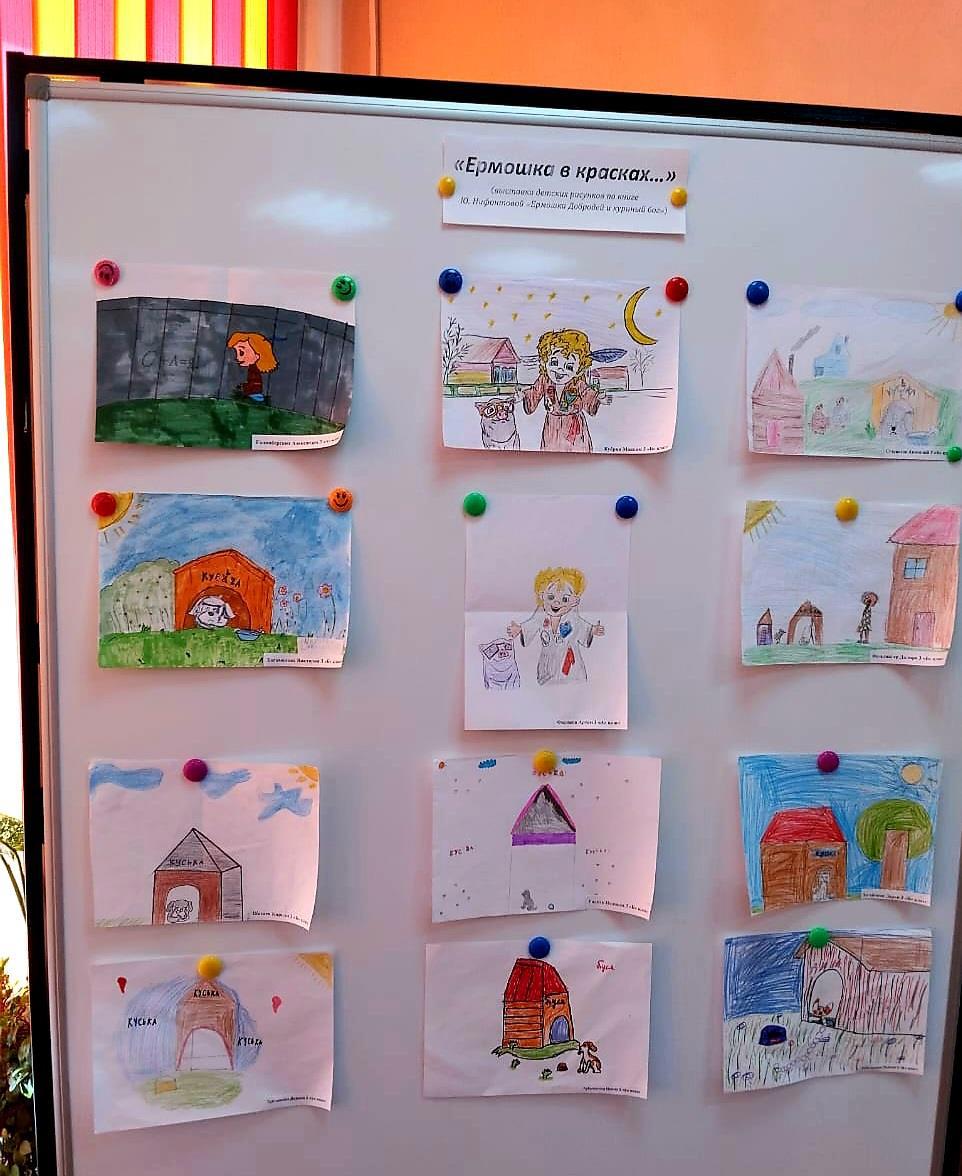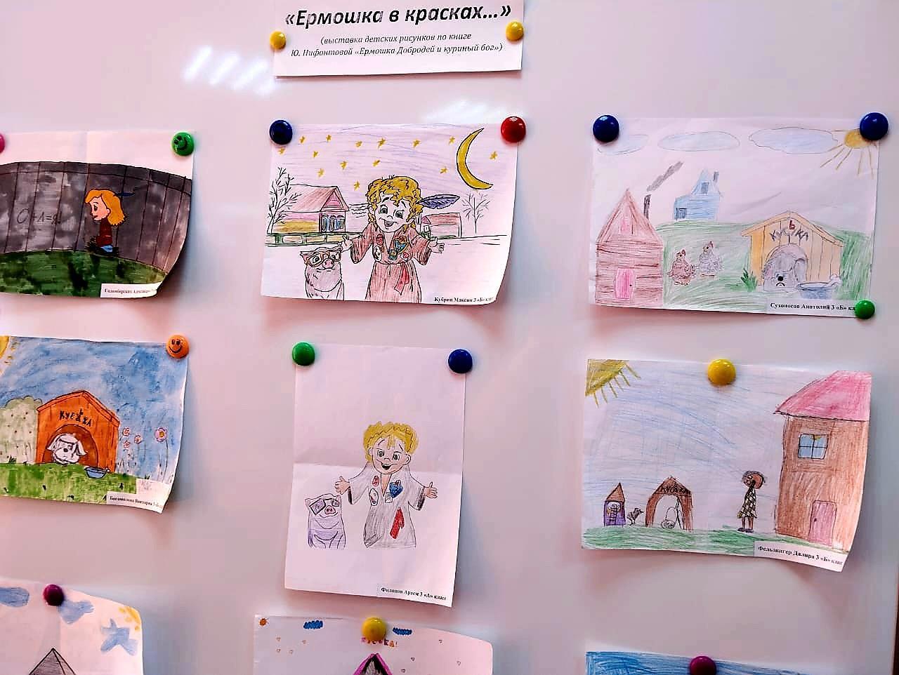 А ещё стены библиотечного зала украсила выставка работ моих маленьких читателей из Буланихи, которые нарисовали героев полюбившейся книжной серии "Ермошка Добродей"!!!
