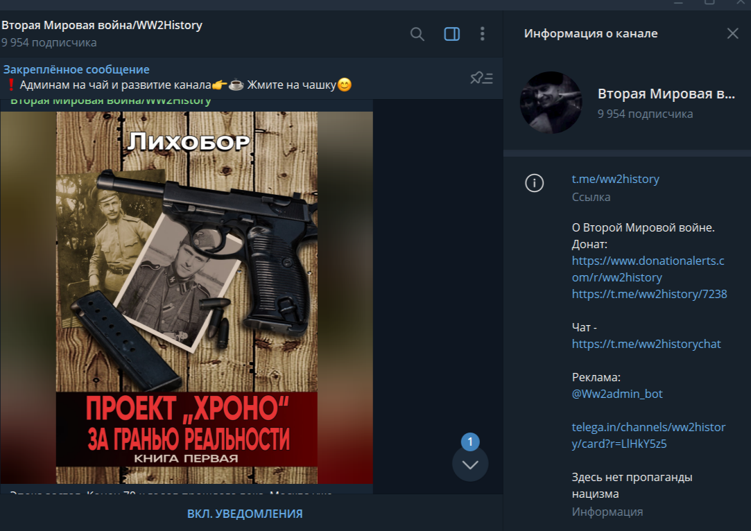 Автор: LichoborНедавно телеграмм-канал "Вторая Мировая война/WW2History" (почти 10.000 подписчиков) совершенно бесплатно и без условий дал рекламу моему роману. Я написал админу, мы обсудили дату выхода анонса и всё. В других схожих по тематике телеграмм-каналах, настырно просили денег - от 300 рублей до 6.000 за сутки.