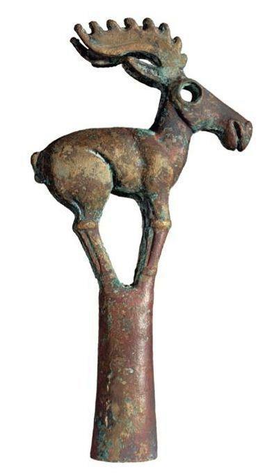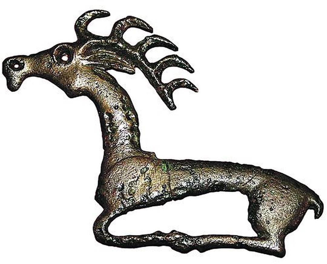 А вот ещё одно изображение лося, которое нашли на Алтае в раскопе Аржаан-1. На этот раз в металле: