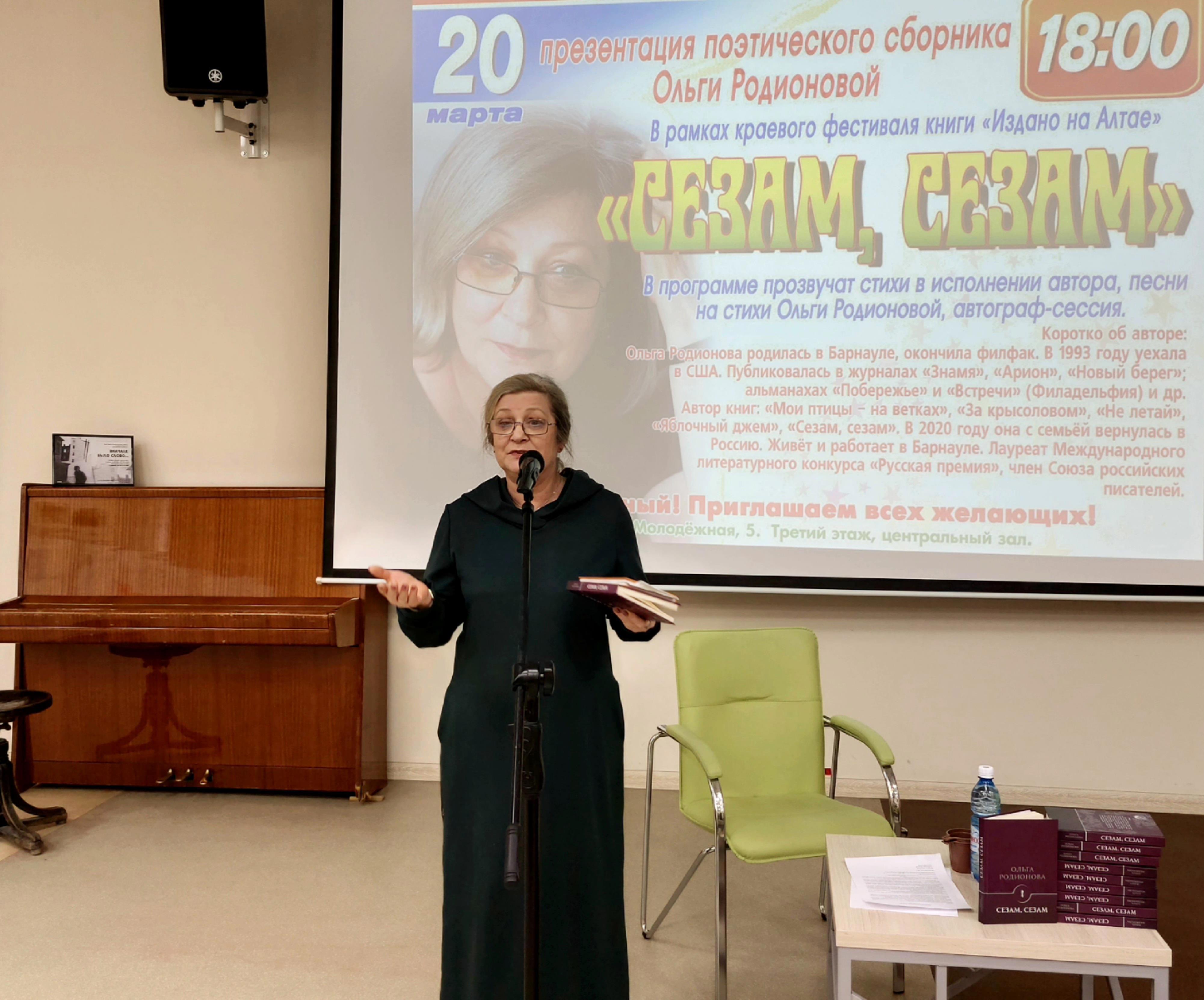 Накануне этого замечательного дня в Алтайской краевой библиотеки состоялся настоящий поэтический праздник - презентация нового сборника стихов поэта Ольги Родионовой "Сезам, сезам".