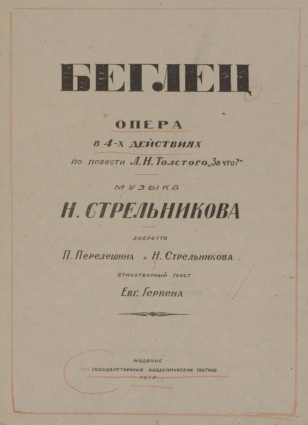 Одним из двух сочинений в этом жанре была опера «Беглец» по повести Л. Н. Толстого «За что?». Она написана в 1932 году. Авторами либретто были сам Н. М. Стрельников и драматург П. А. Перелешин. Премьера спектакля состоялась 26 мая 1933 г. в Государственном театре оперы и балета в Ленинграде. В течение месяца опера шла с успехом, но уже в мае появились первые критические статьи, которые, в конечном счете, решили ее судьбу. В них Стрельникова обвинили в том, что он не преодолел влияния буржуазных оперных композиторов конца XIX и начала XX столетий и в том, что на первый план им выведены лирические взаимоотношения героев, а не революционная сущность произведения. Причем музыкальное содержание оперы, первоначально воспринятое критикой благосклонно («...его оркестр выразителен, хоры полнозвучны, его вокальные партии мелодичны...»), впоследствии подверглось резкой критике. Достоинства музыки, признанные, в частности, В. М. Богдановым-Березовским, не помешали ему обвинить Стрельникова в «покорном, безвольном следовании канонизированным образцам буржуазной мелодраматической оперы “веристского” типа...», а сама опера, по его словам, стала «больше неудачей композитора, чем неудачей театра». Главной же причиной появления критических высказываний стала не музыка, а отражение на сцене исторического периода, связанного с подавлением польского восстания 1831 г., а также тот факт, что главным героем оперы явился польский шляхтич, сосланный на Урал. После посещения спектакля наркомом просвещения А. С. Бубновым опера была снята с репертуара и постепенно забыта. О ней упомянули, причем в положительном ключе, лишь в 1938 г, судя по всему, в связи с  арестом и расстрелом Бубнова. Но до этого, в 1935 году, композитор был арестован НКВД. Спас его знаменитый композитор Ю. А. Шапорин, который заступился за него лично перед Сталиным.