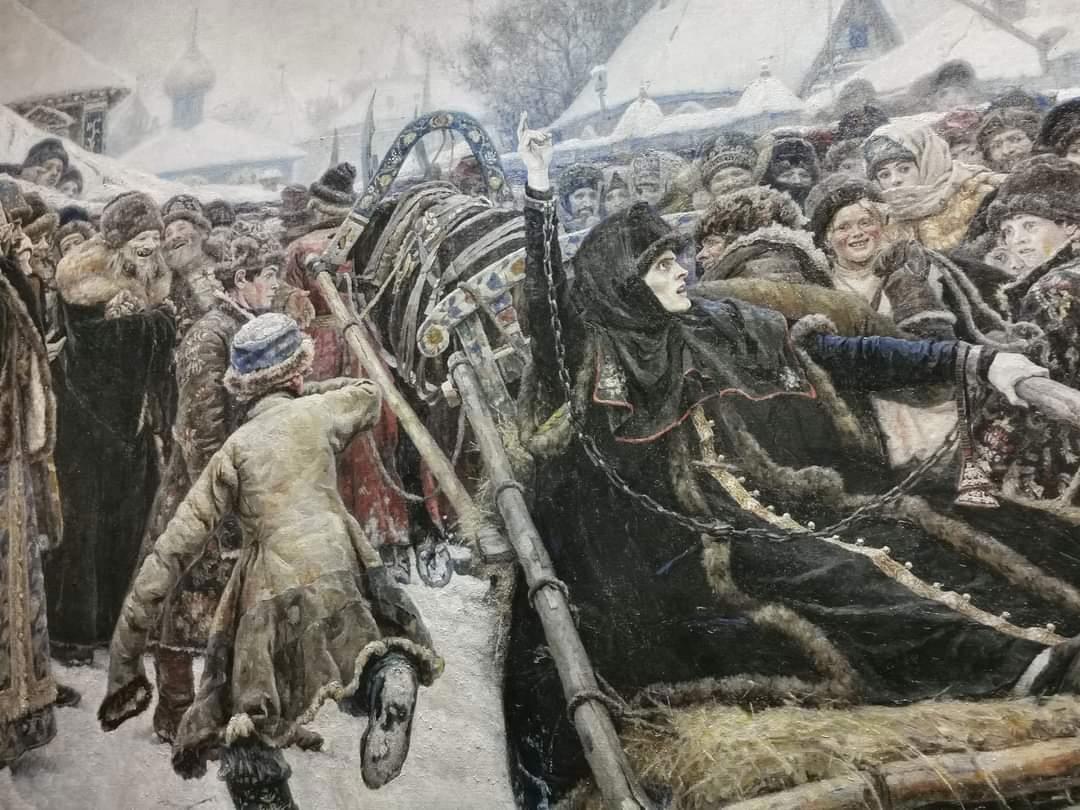 Суриков - художник философ, русский до мозга костей, все его картины - отражение традиций, обрядов, наполненные трагизмом, происходивших событий. Равнодушием от его картин никогда для меня не веяло, всегда глядя на них испытывала горечь утраты. А потеряли мы многое: руницу, летоисчисление, 750 лет нашей истории, самобытность, летописи, труды Ломоносова и самого ученого, затравленного немцами, трехсотлетних старцев, самобытность и самостоятельность, дар волхования, управление природой и многое другое.И вот эта женщина все понимала, ей горько было, не могла она не протестовать, потому что чувствовала, что все к этому идет, так начинался хитрый захват Руси.Сильная и одинокая личность в окружении толпы не понимающей этого - такой изобразил Морозову Суриков. Трагедия бунтаря- одиночки.