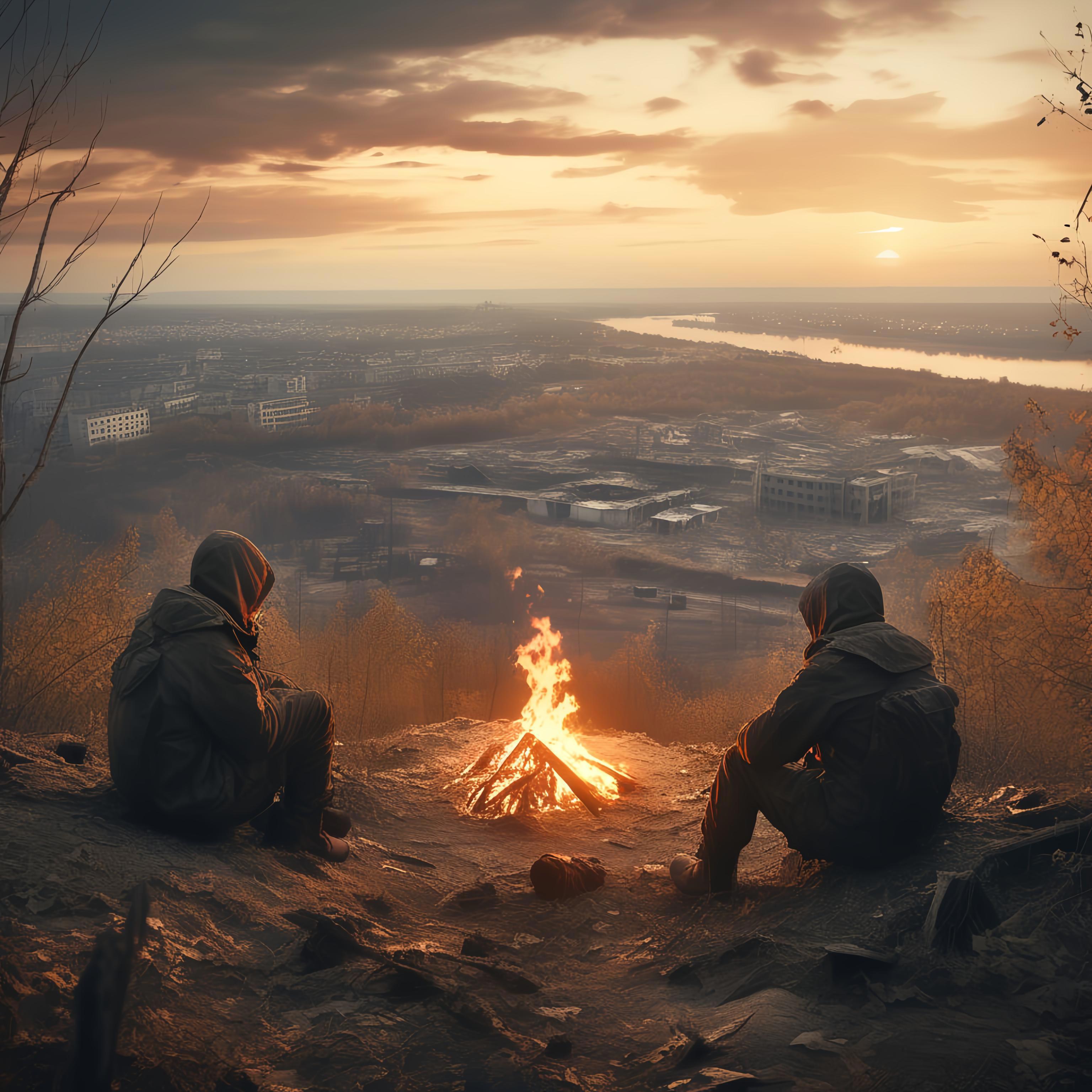 Автор: Иван ОбуховСолнце садилось, заливая своим красным светом округу. На вершине холма у небольшого костра сидели Фикса и Кот. Под их ногами раскинулось бескрайнее море леса с пересекающей его лентой шоссе. Вдали чернела полуразрушенная Припять и ЧАЭС.