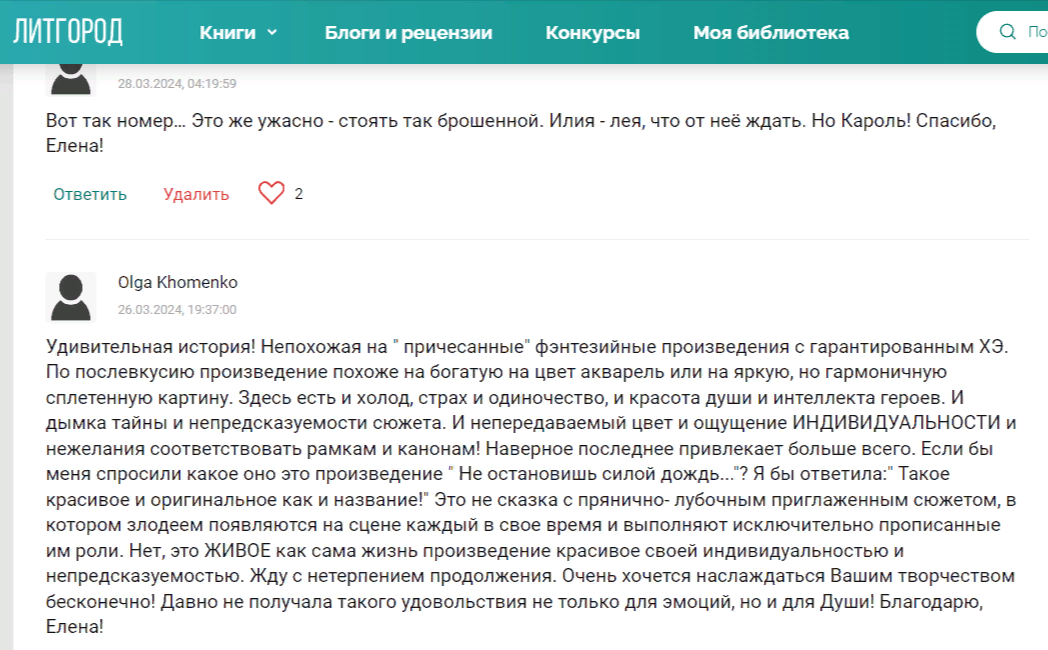 Такие отзывы помогают не пасть духом. Ведь из отзыва читательницы стало ясно, что есть те, кому нравится именно эта черта моего творчества - отклонение от канона жанра. Таких читателей меньше, но они есть, и я пишу для них.