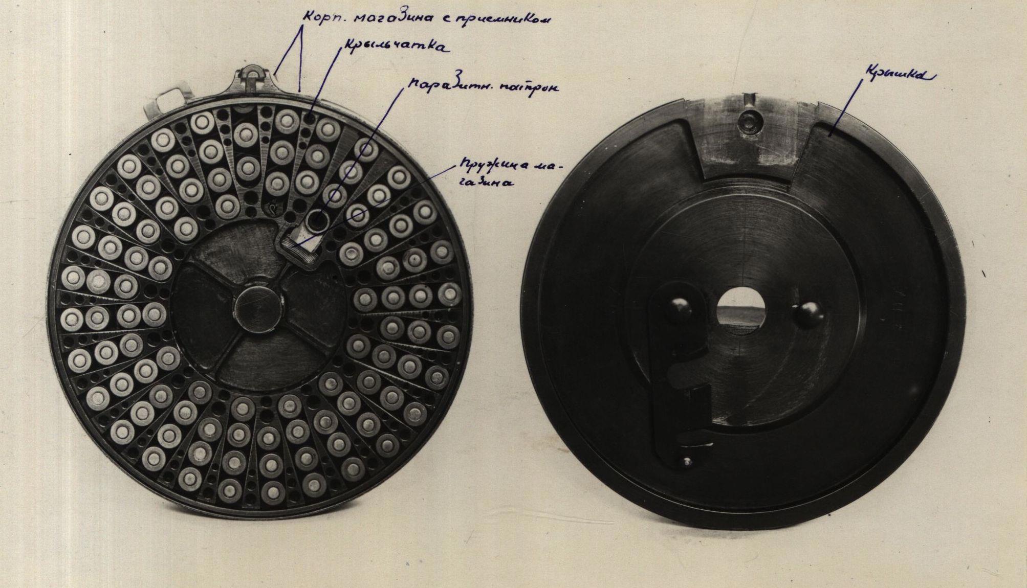 Отчасти это название было даже оправдано. На проходивших в ноябре 1940 года испытаниях контрольные взвешивания показали, что опытный ППШ (Шпагина) и валовый ППД-40 весят без магазина и патронов примерно 3,4-3,5 кг. Образец Шпитального на этом взвешивании оказался почти на килограмм тяжелее. Но это было еще не все. Если к "шпагину" и "дегтяреву" шли дисковые магазины на 71 патрон, то к "пехотному пулемету" в ОКБ-15 и диски сделали соответствующие – на 97 и 100 патронов. Правда, с полностью снаряженным магазинам на 100 патронов масса "пехотного пулемета" перевалила за семь килограмм – действительно, вполне "пулеметный" вес, столько же весил (без магазина и патронов) ручной пулемет Дегтярева.