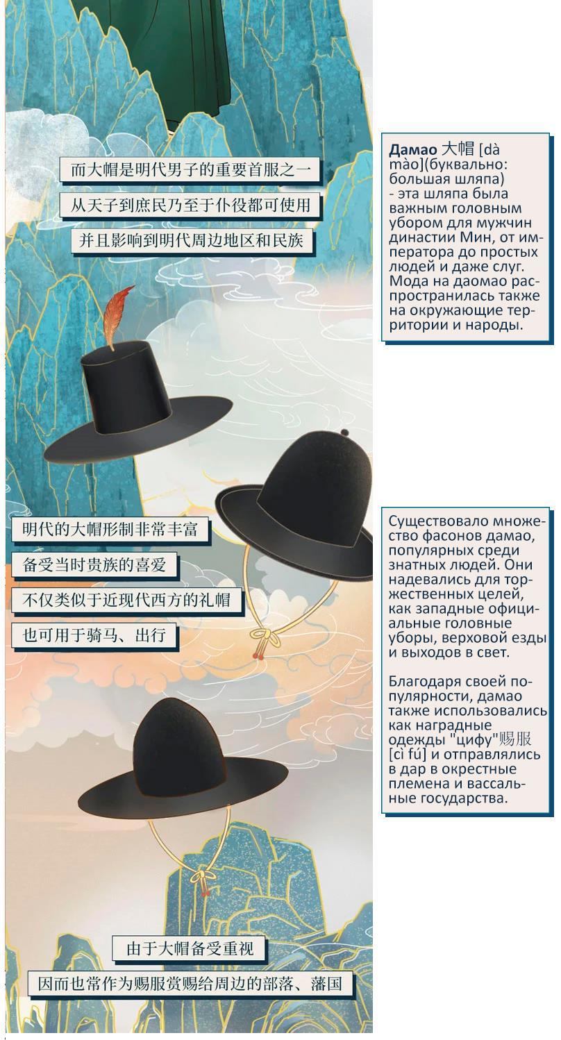Дамао 大帽 [dà mào](буквально: большая шляпа) - эта шляпа была важным головным убором для мужчин династии Мин, от императора до простых людей и даже слуг. Мода на дамао распространилась также на окружающие территории и народы.