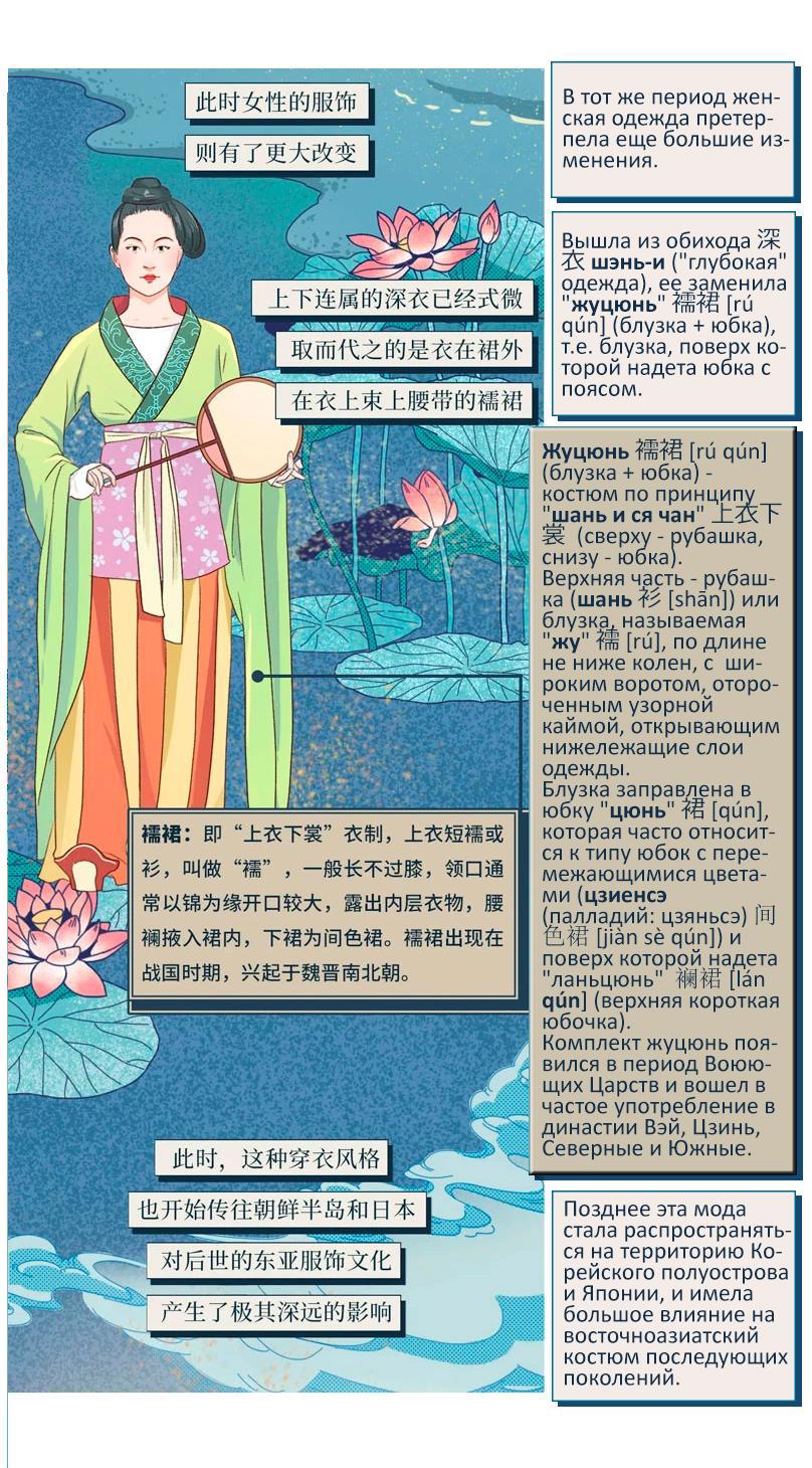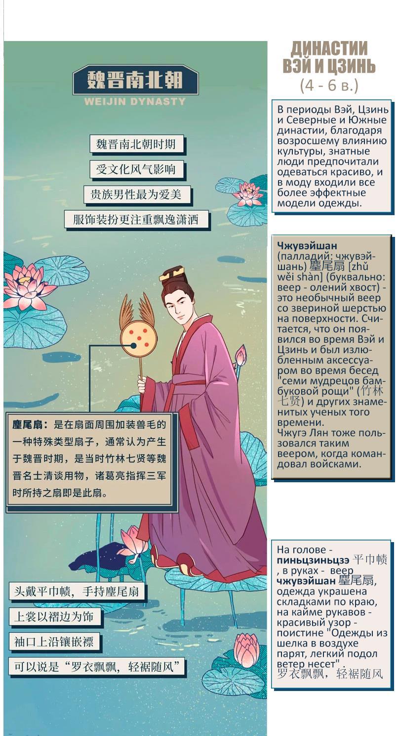 В периоды Вэй, Цзинь и Северные и Южные династии, благодаря возросшему влиянию культуры, знатные люди предпочитали одеваться красиво, и в моду входили все более эффектные модели одежды.