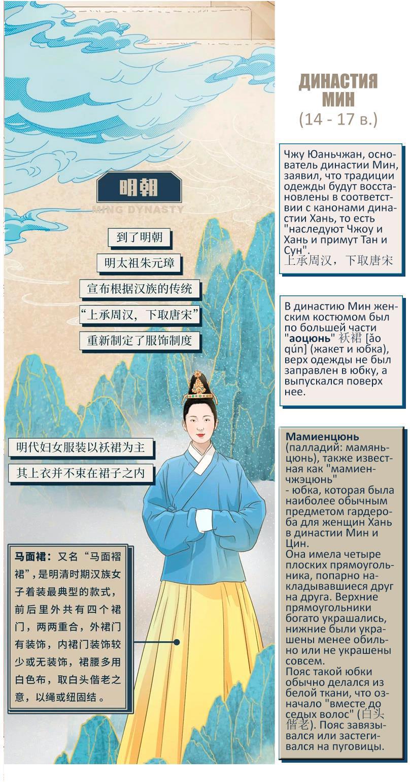 В династию Мин женским костюмом был по большей части "аоцюнь" 袄裙 [ǎo qún] (жакет и юбка), верх одежды не был заправлен в юбку, а выпускался поверх нее.