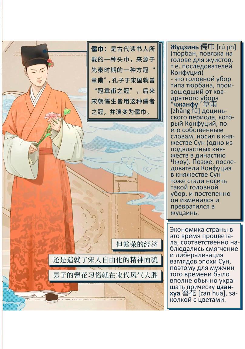 Экономика страны в это время процветала, соответственно наблюдались смягчение и либерализация взглядов эпохи Сун, поэтому для мужчин того времени было вполне обычно украшать прическу цзанхуа 簪花 [zān huā], заколкой с цветами.